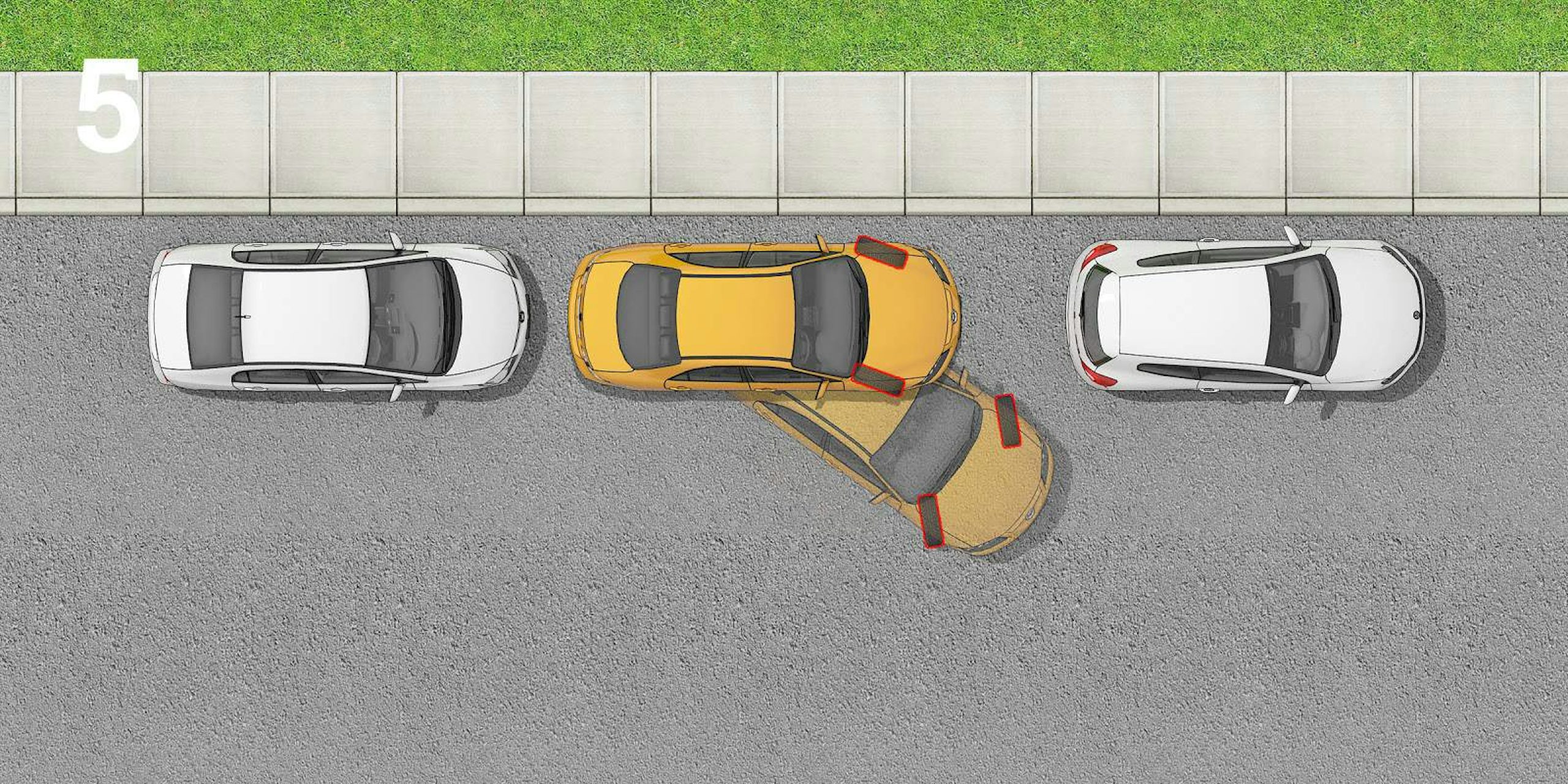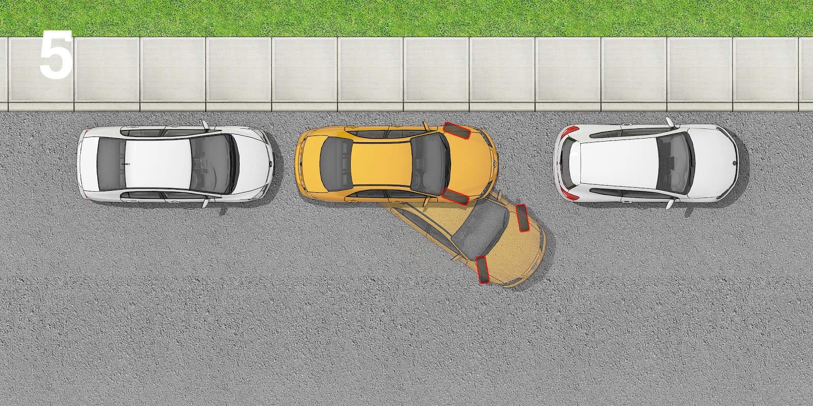 Once you can see the full front of the car in your right side mirror, you need to reverse straight to move closer to the kerb. Turn the wheels straight and reverse until your left side mirror covers the taillight of the vehicle in front (see illustration 4).