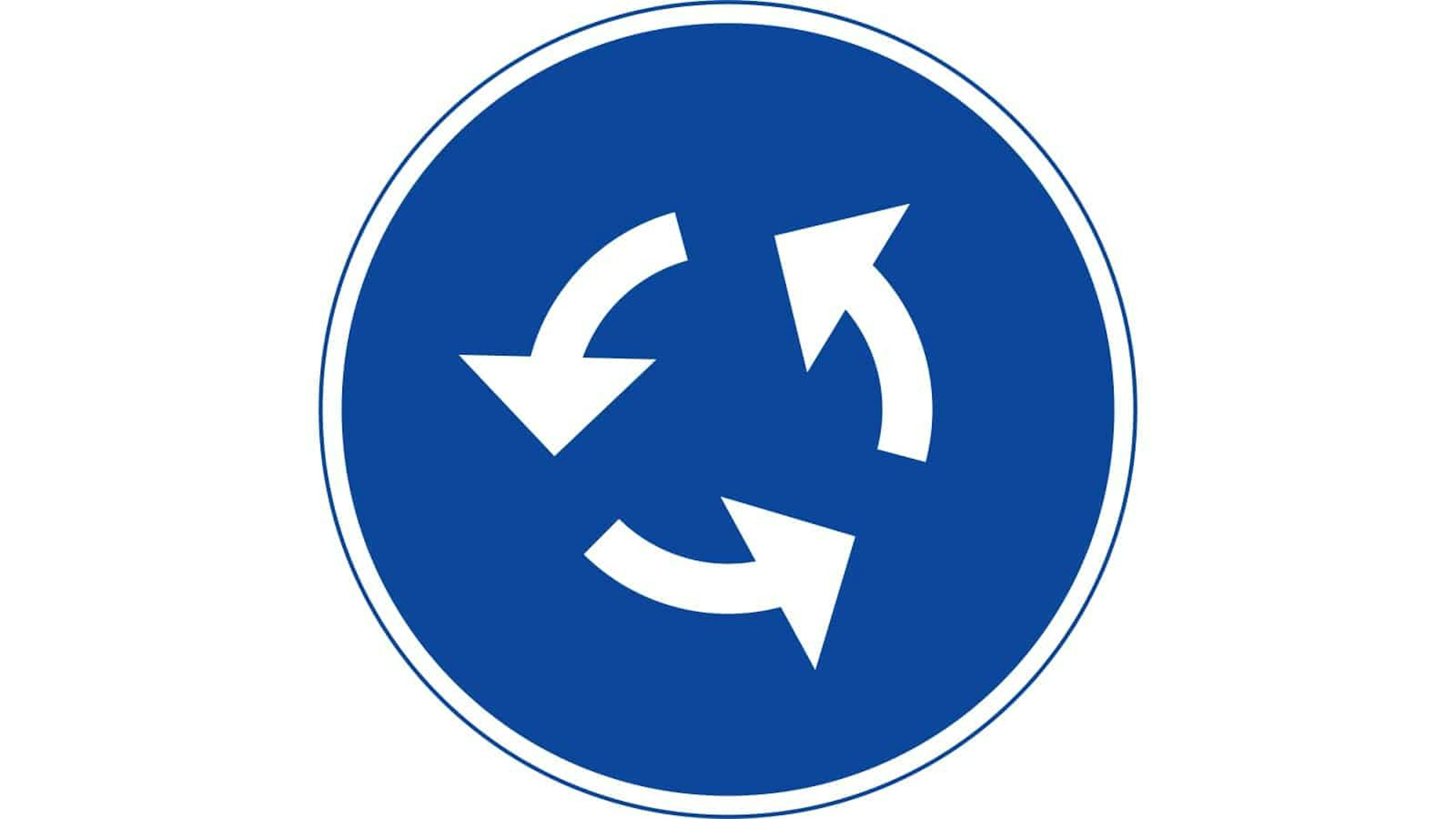 Cirkulationsplats. Detta påbudsmärke visar att du närmar dig en cirkulationsplats (rondell). Kör försiktigt och var beredd att lämna företräde åt bilar som redan kör i cirkulationsplatsen.