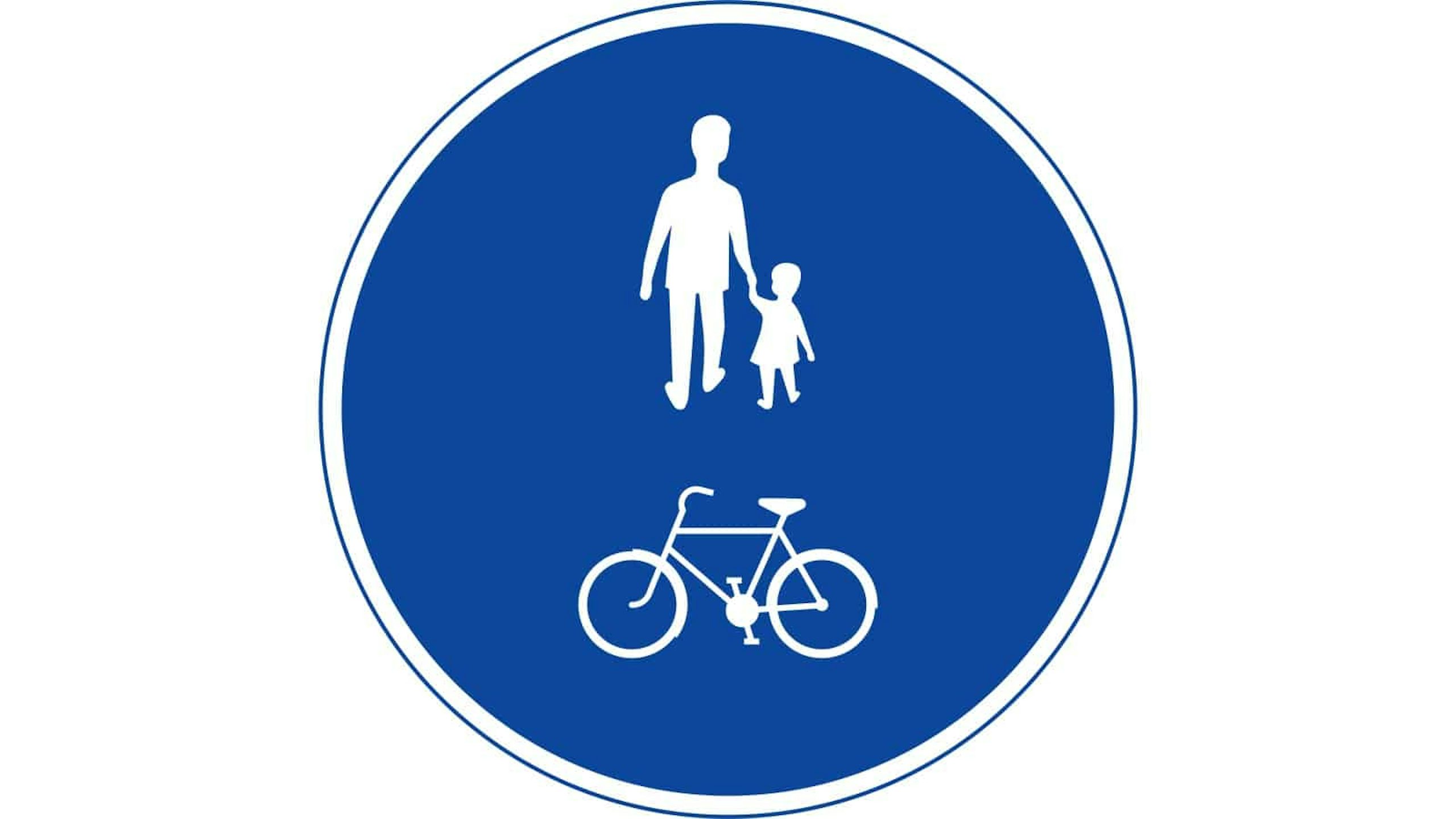 Gemensam gång- och cykelbana utan skiljelinje. Denna påbudsskylt anger en gemensam gång- och cykelbana som inte delas av en skiljelinje. Håll utkik för cyklar som kan komma i hög fart och fotgängare. Detta är speciellt viktigt vid korsningar eller utfarter.