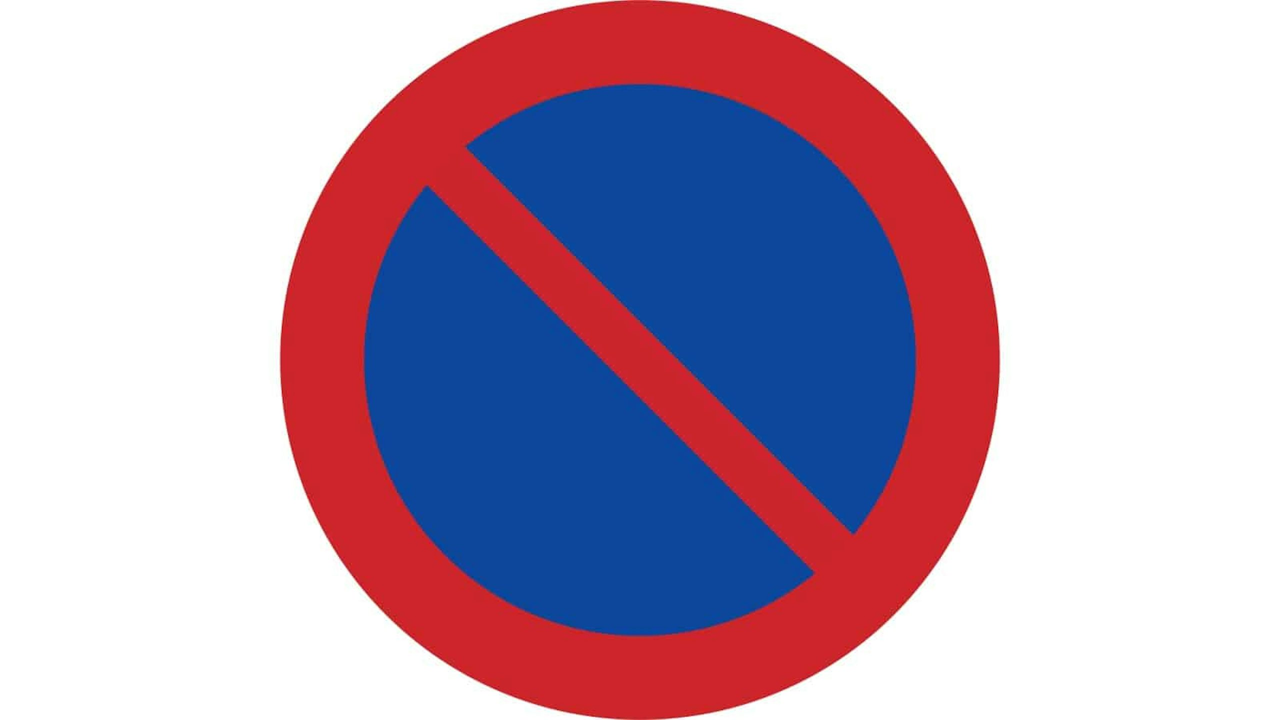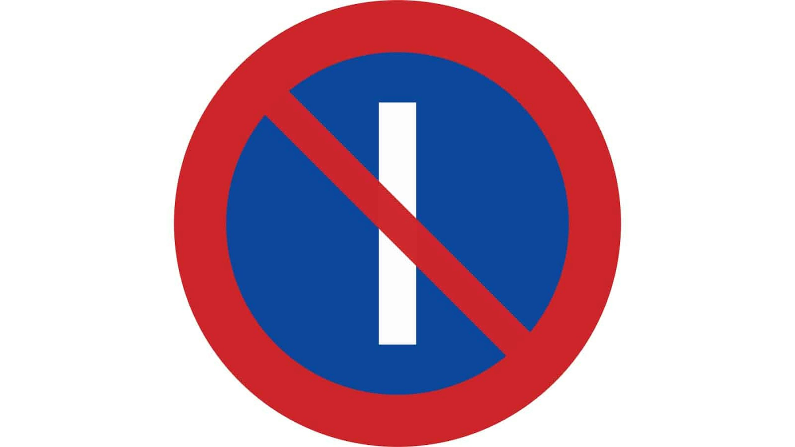 Förbud mot att parkera. Denna skylt förbjuder dig att parkera. Förbudet gäller på den sida av vägen där skylten är placerad. Det är dock inte förbjudet att stanna.