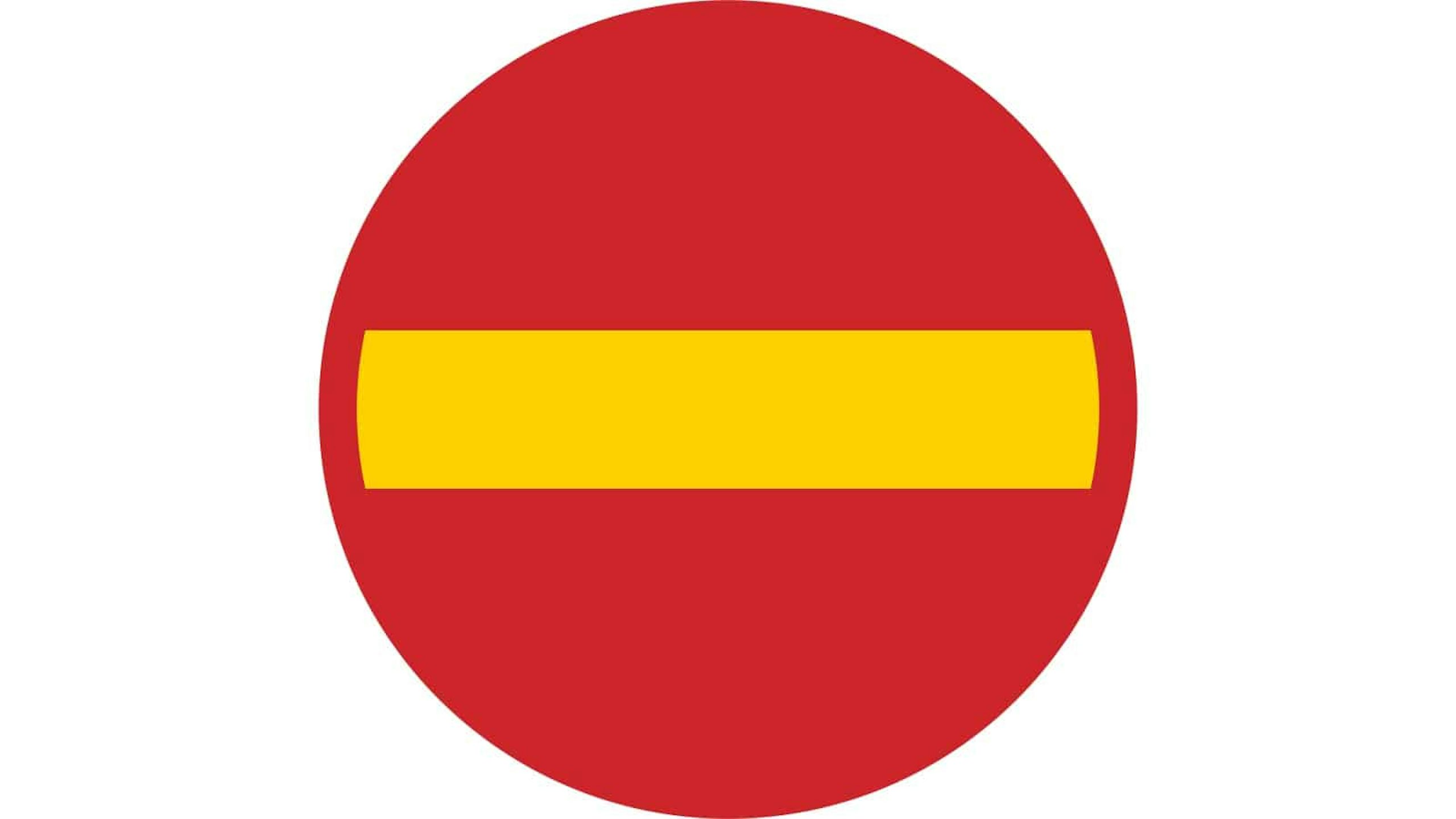 Förbud mot att passera med fordon. Passera ej skylten då den förbjuder fordon att passera. Detta gäller i båda riktningarna av märket.