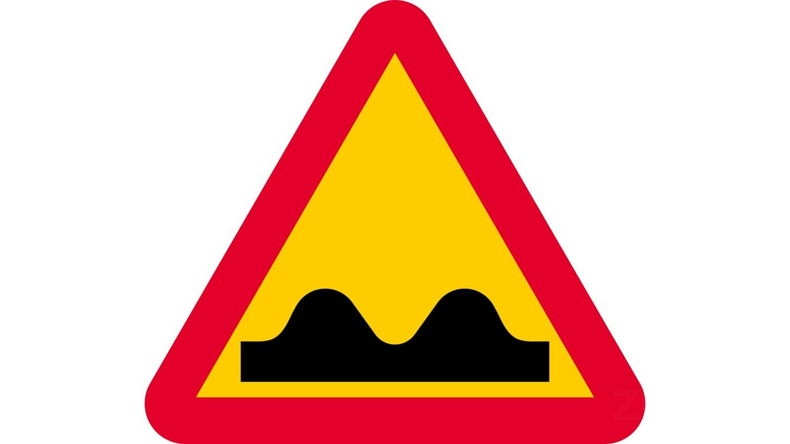Varning för ojämn väg. Denna skylt kan förekomma om vägen är ojämn eller skadad. Du rekommenderas att sänka hastigheten på vägar som är ojämna eller skadade.