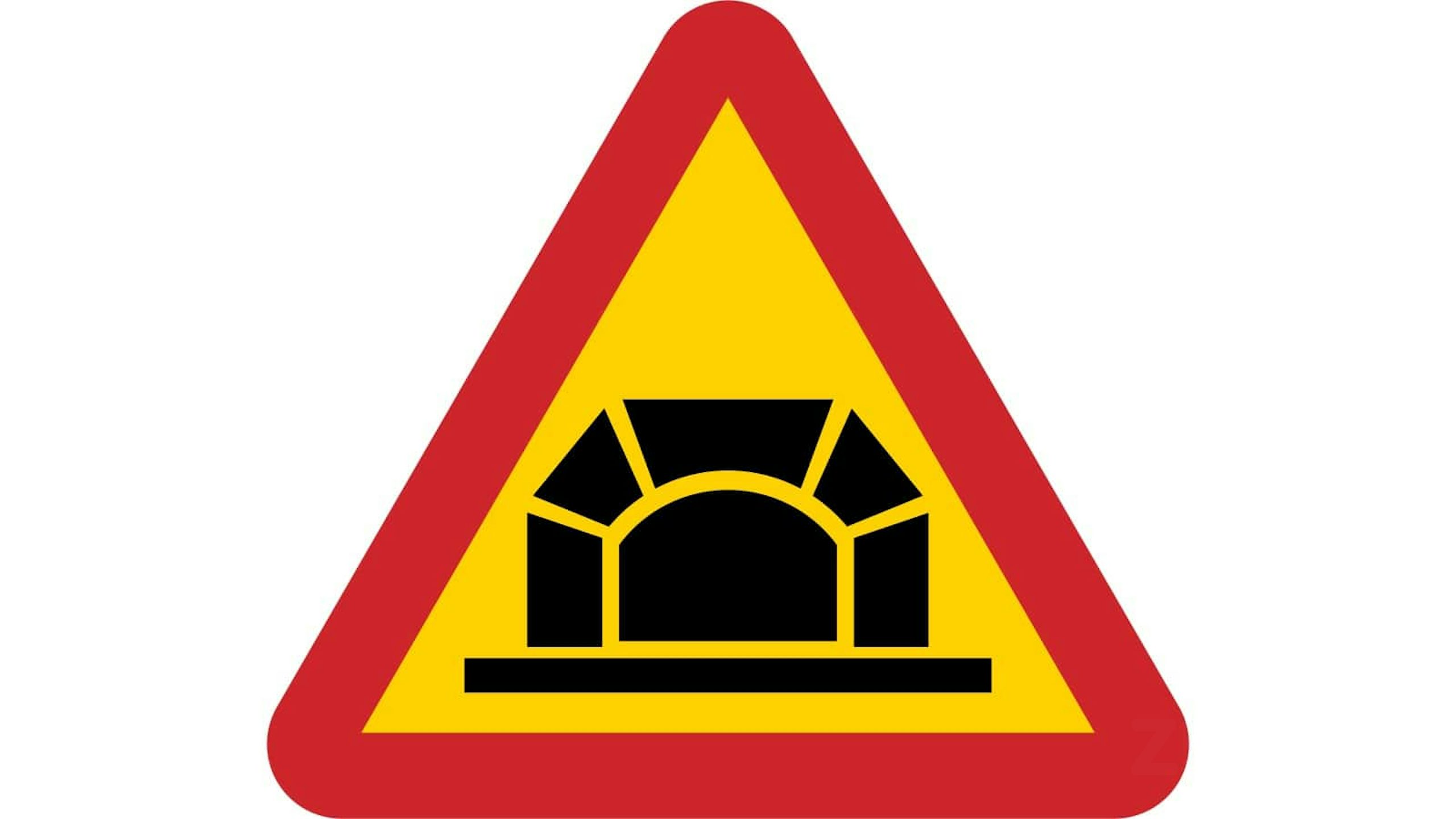 Varning för tunnel. Detta varningsmärke varnar för en tunnel. Tänk på att köra extra försiktigt i en tunnel och helst undvika att byta fil då olyckor i tunnlar kan bli mycket allvarliga.