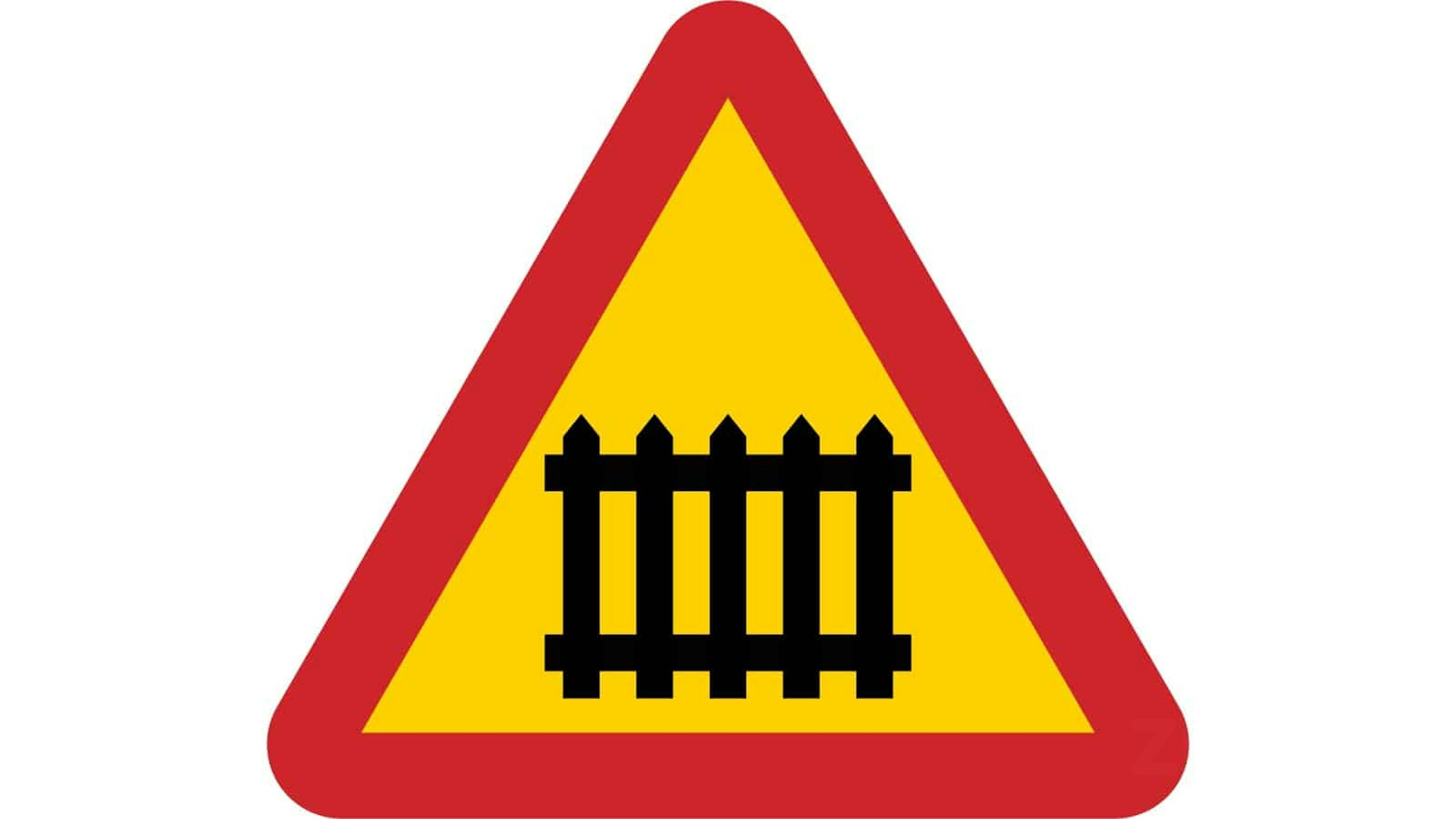 Varning för järnvägskorning med bommar. Varningsmärket varnar för en järnvägskorsning med bommar. Oavsett om det finns bommar eller inte måste du sakta ner och vara väldigt försiktig när du närmar dig järnvägen. Varningssignaler och bommar kan vara ur funktion, och därför bör man inte lita blint på dem. Titta vänster och höger flera gånger innan du kör över spåret för att säkerställa att det inte kommer ett tåg.
