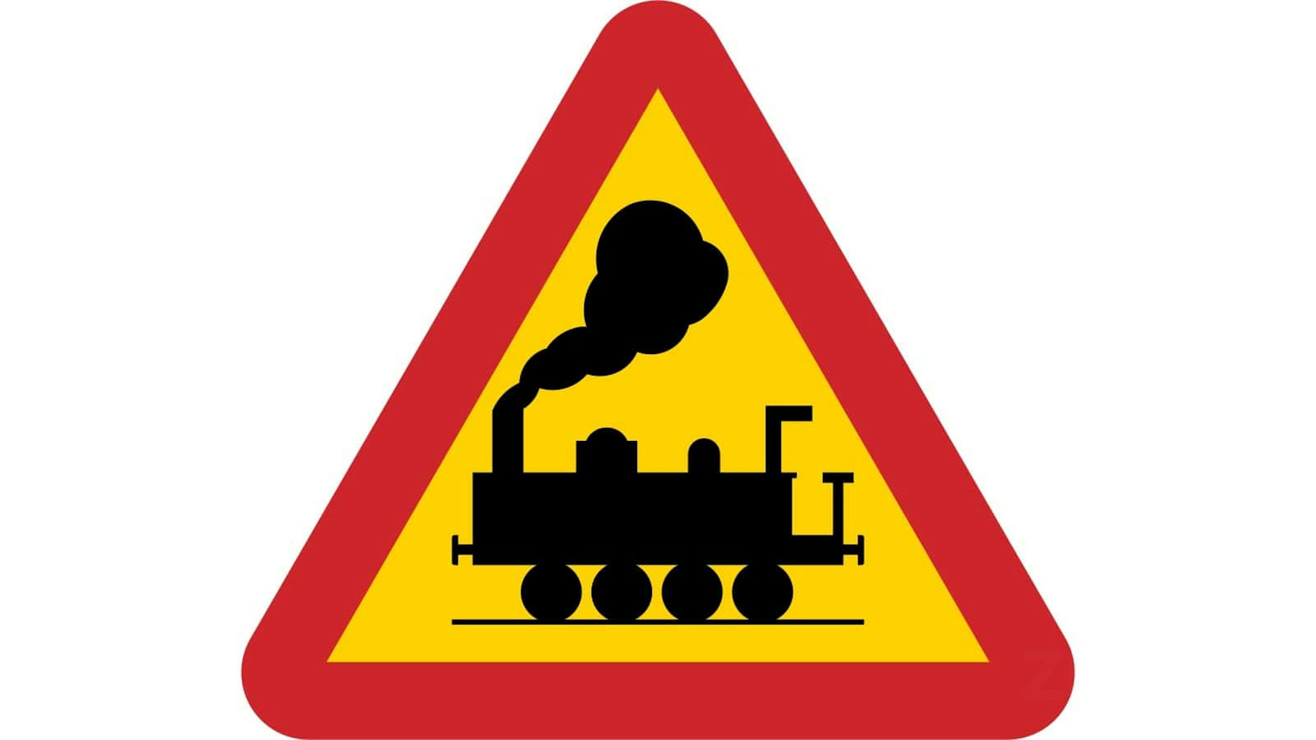 Varning för järnvärgskorsning utan bommar. Varningsmärket varnar för en järnvägskorsning utan bommar. Sakta ner och var väldigt försiktig när du närmar dig spåret. Var noga med att kontrollera att inget tåg närmar sig före du kör över spåret.