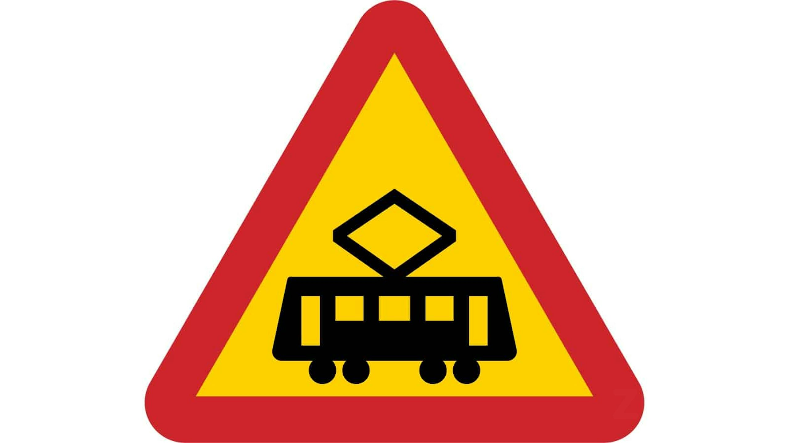 Varning för spårväg utan bommar. Detta varningsmärke varnar för en korsning med spårväg utan bommar. Sakta ner och var väldigt försiktig när du närmar dig spåret. Titta vänster och höger flera gånger innan du kör över spåret.