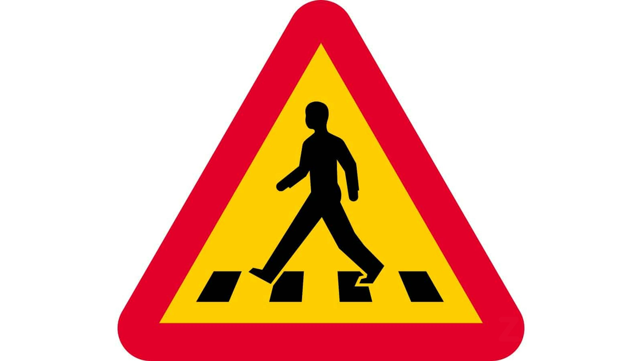 Varning för övergångsställe. Sakta ner hastigheten och förbered dig för att lämna företräde åt fotgängare vid behov. De har alltid företräde vid övergångsställen
