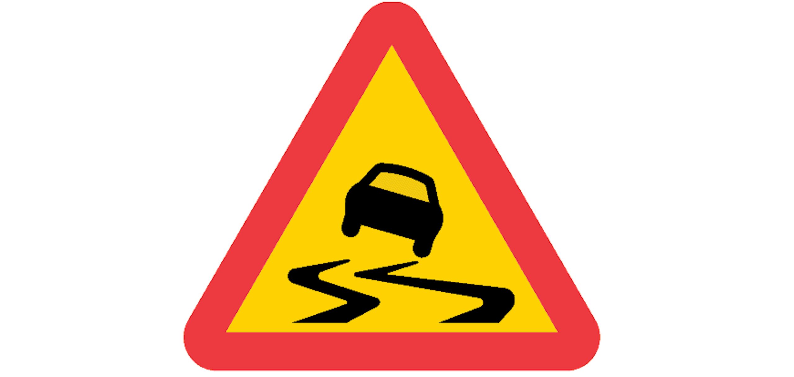 Varning för slirig väg. Trafikmärket betyder varning för slirig väg. Oftast gäller det vägar där ny vägbeläggning läggs ut eftersom nyasfalterade vägar kan vara hala. Märket används generellt inte för halka på grund av snö eller is, men om det finns särskilda skäl kan det även användas på grund av halka eller is.
