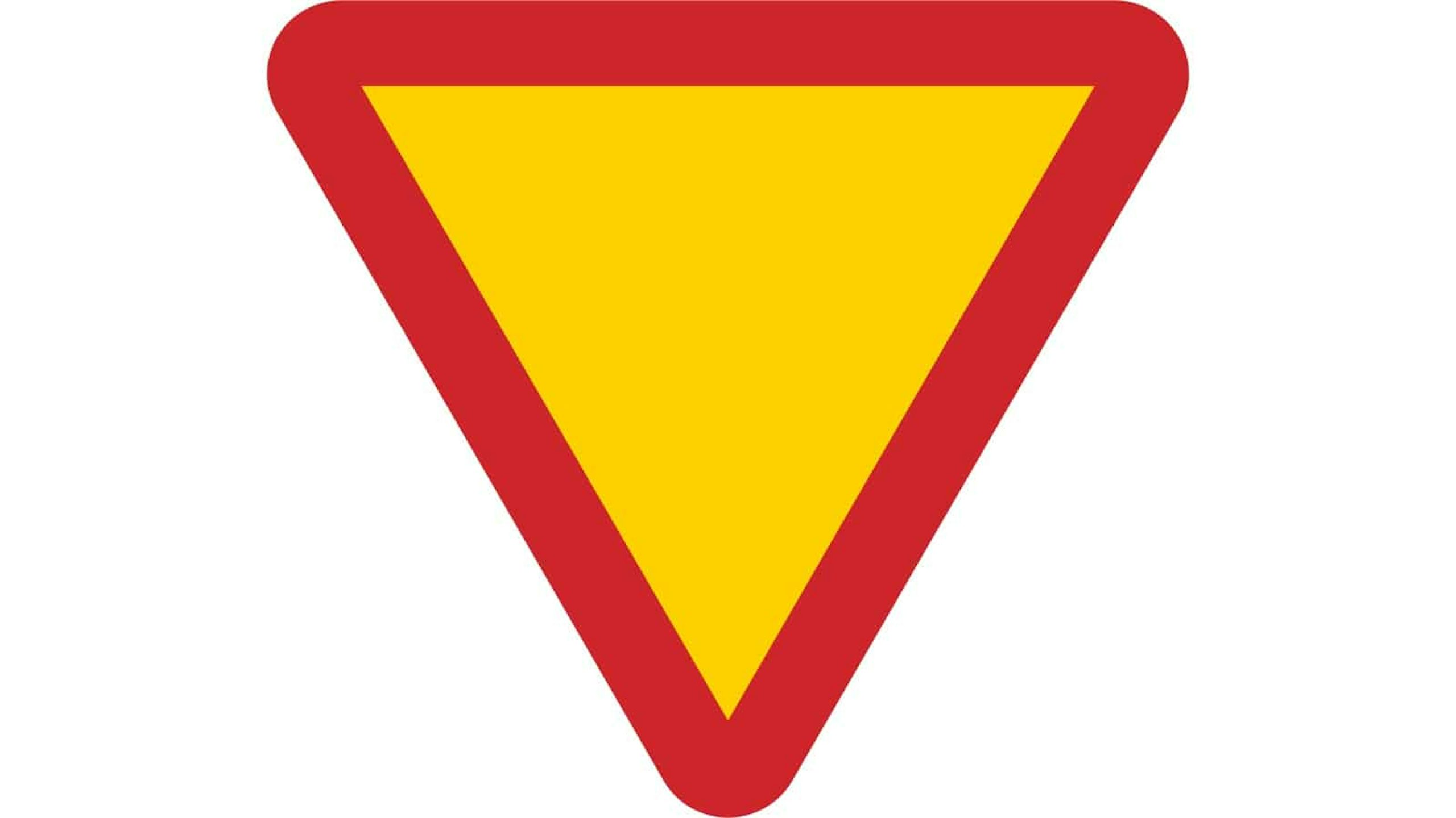 Väjningsplikt. Skylten innebär att du måste lämna företräde åt korsande trafik. Om du ser denna skylt, sänk hastigheten och gör dig redo att väja för andra bilar vid behov. Du måste inte stanna vid skylten om det inte finns någon korsande trafik.