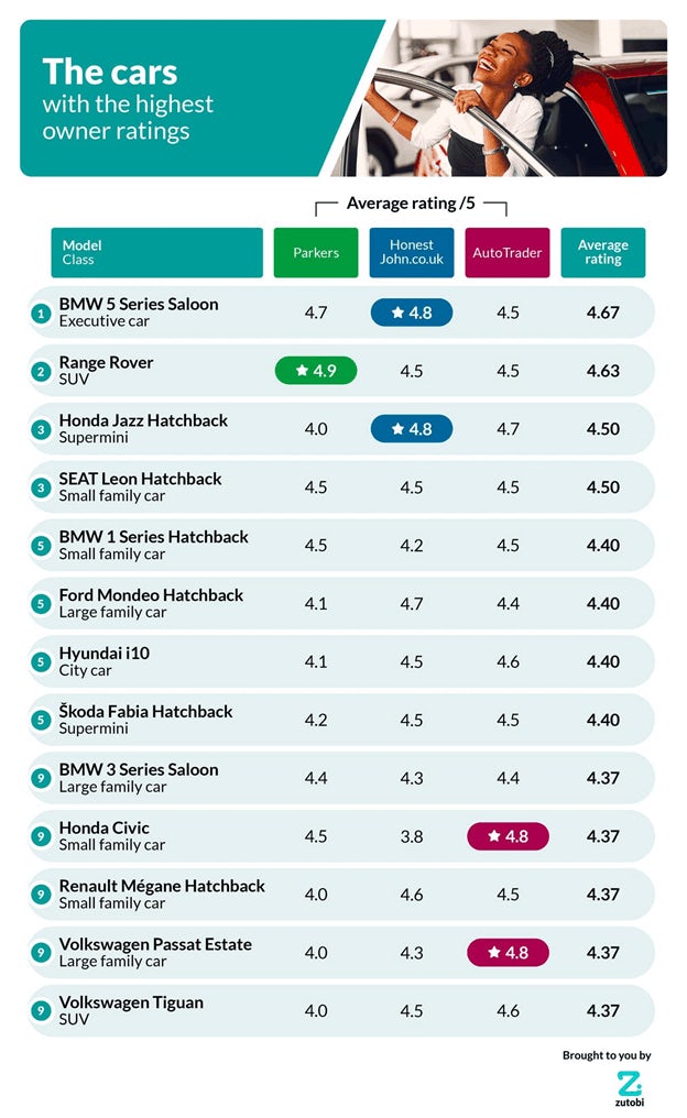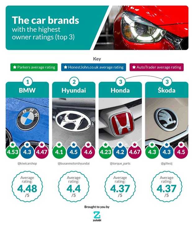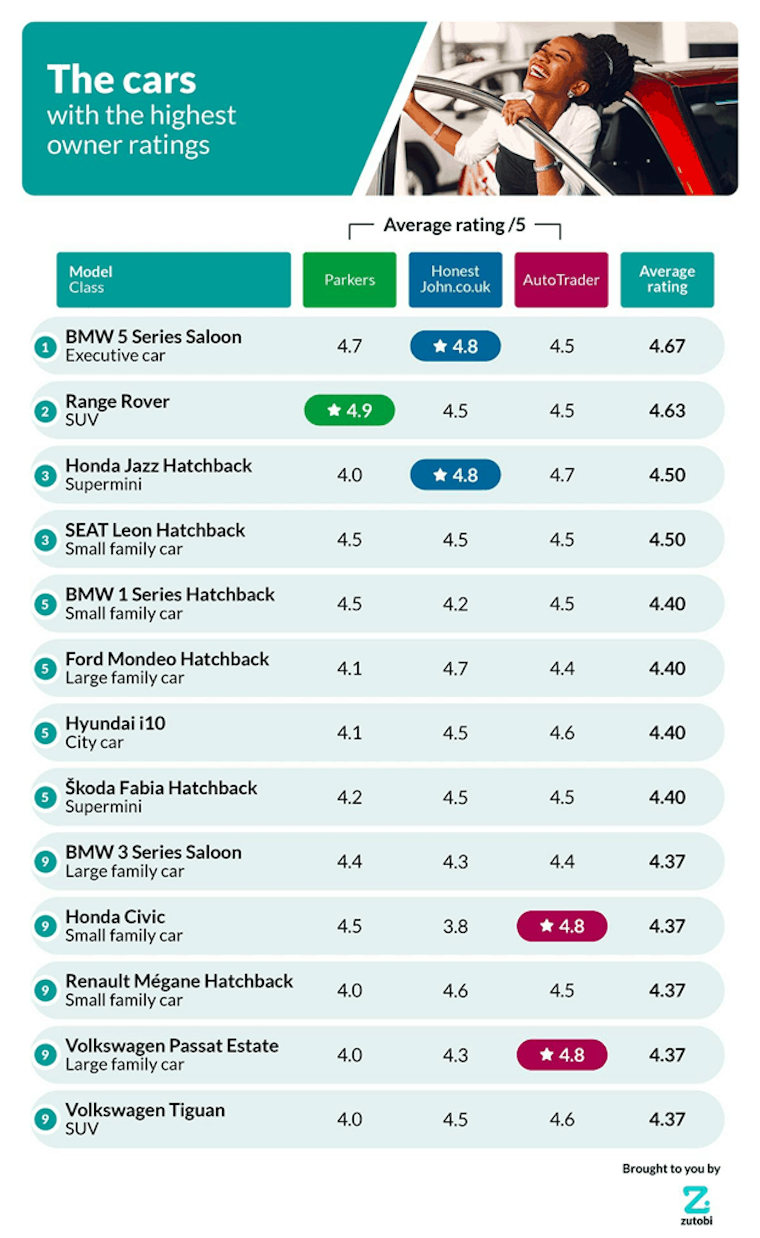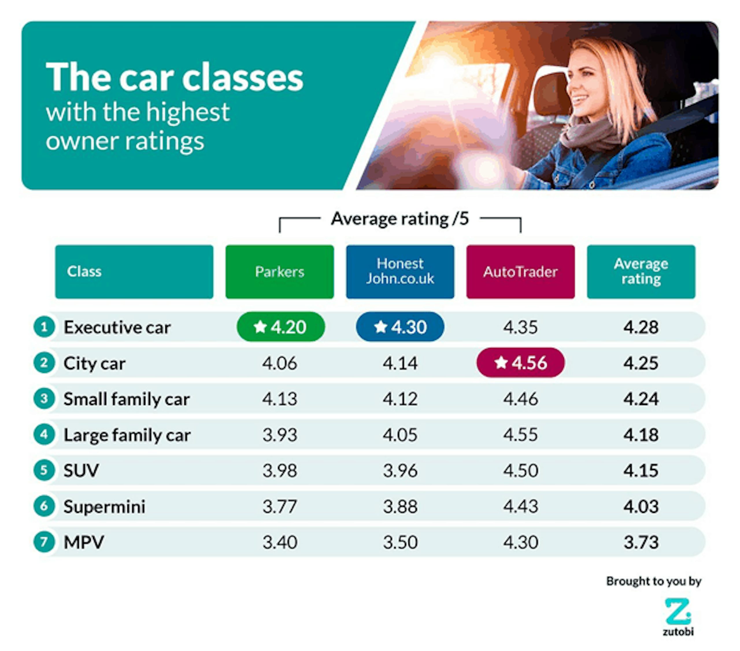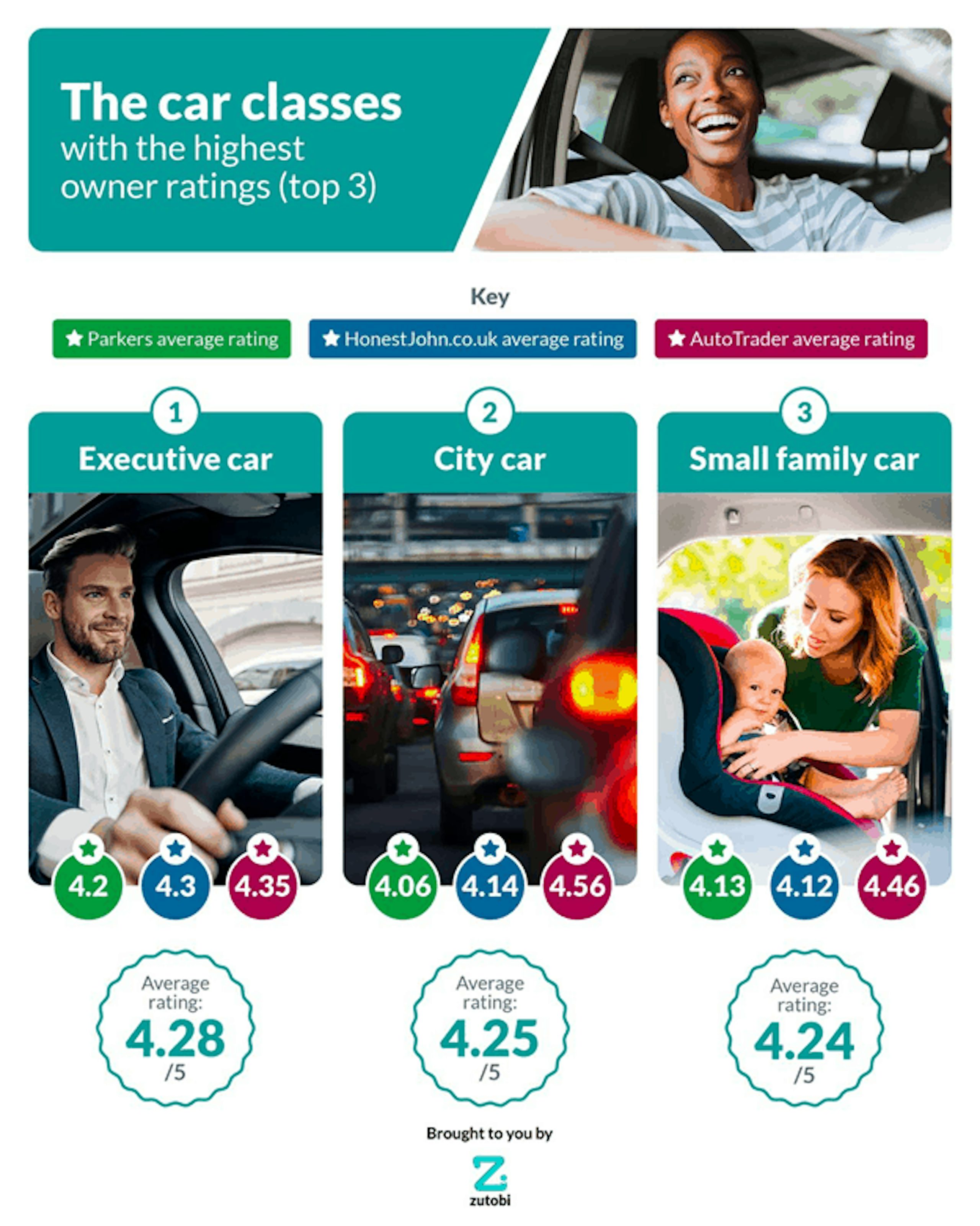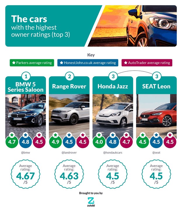 For each vehicle, we sourced the average owner rating out of five according to three sites: Parkers, HonestJohn.co.uk, and AutoTrader.