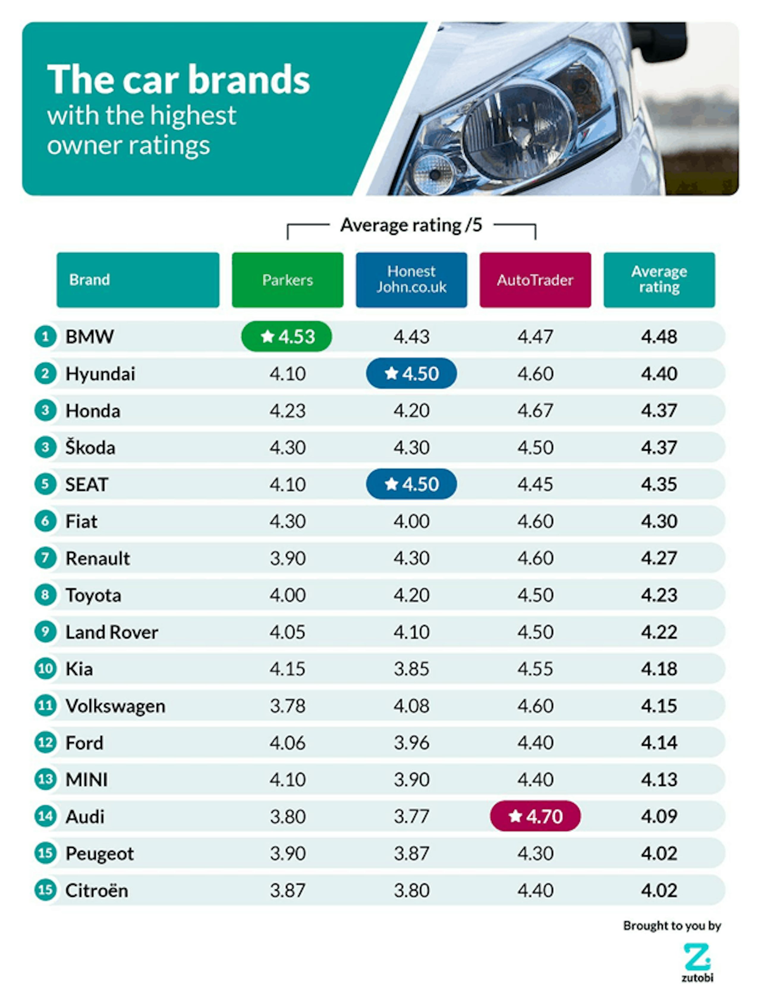 Looking at each of the 50 most popular vehicles in the UK, the brand which received the highest owner rating on average is BMW, with an average score of 4.47.