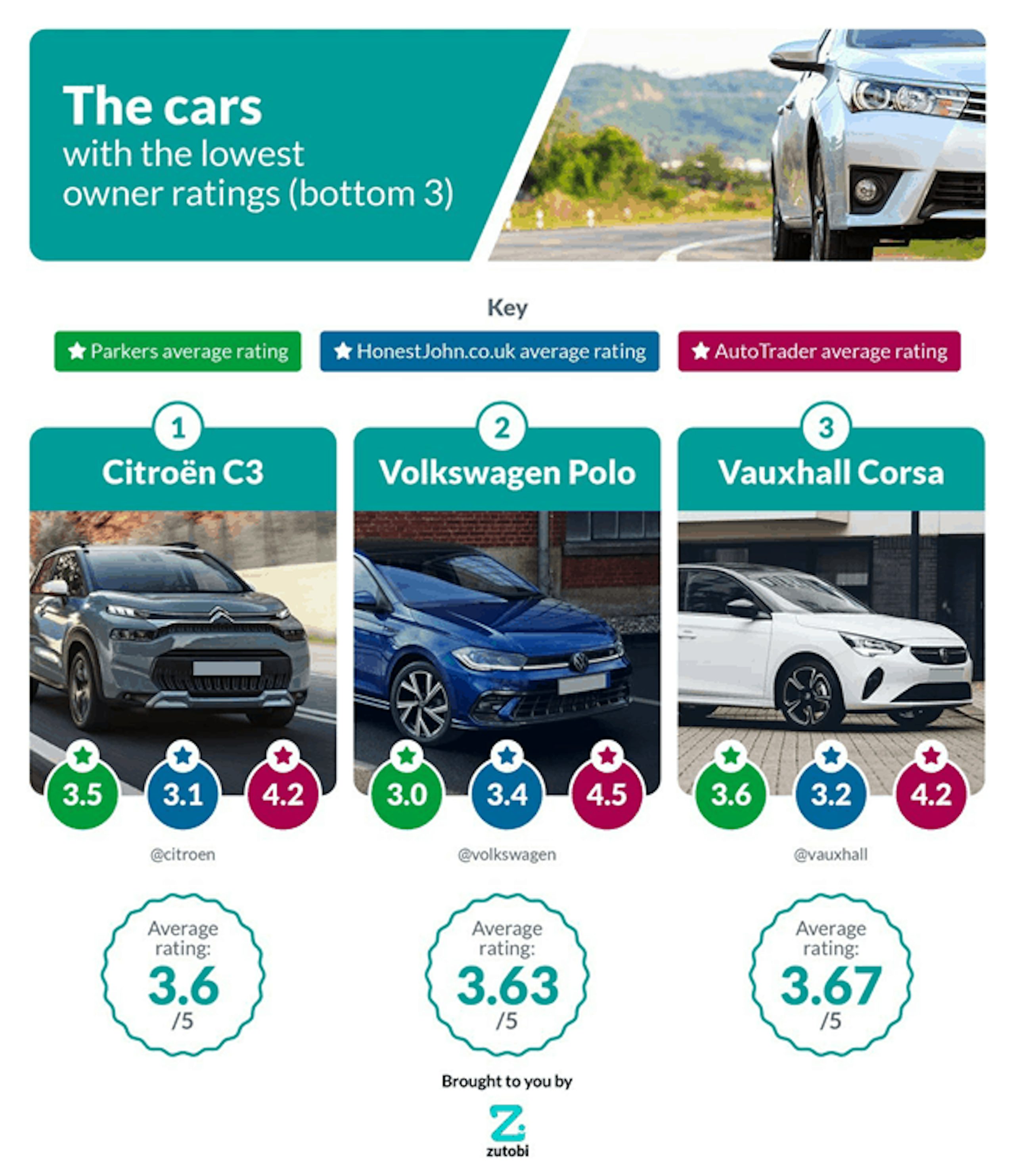 At the other end of the scale, the car with the lowest rating across all three sites was the Citroën C3, with an average rating of 3.6 out of 5, which is still fairly respectable!