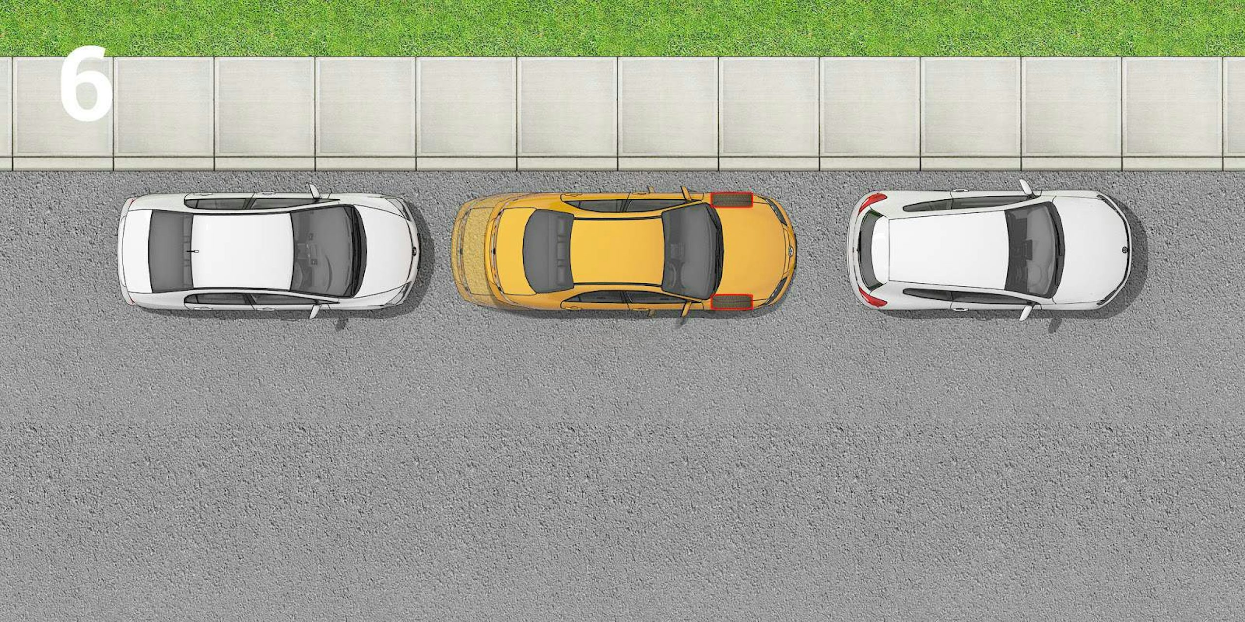 Once you can see the full front of the car in your right side mirror, you need to reverse straight to move closer to the kerb. Turn the wheels straight and reverse until your left side mirror covers the taillight of the vehicle in front (see illustration 4).