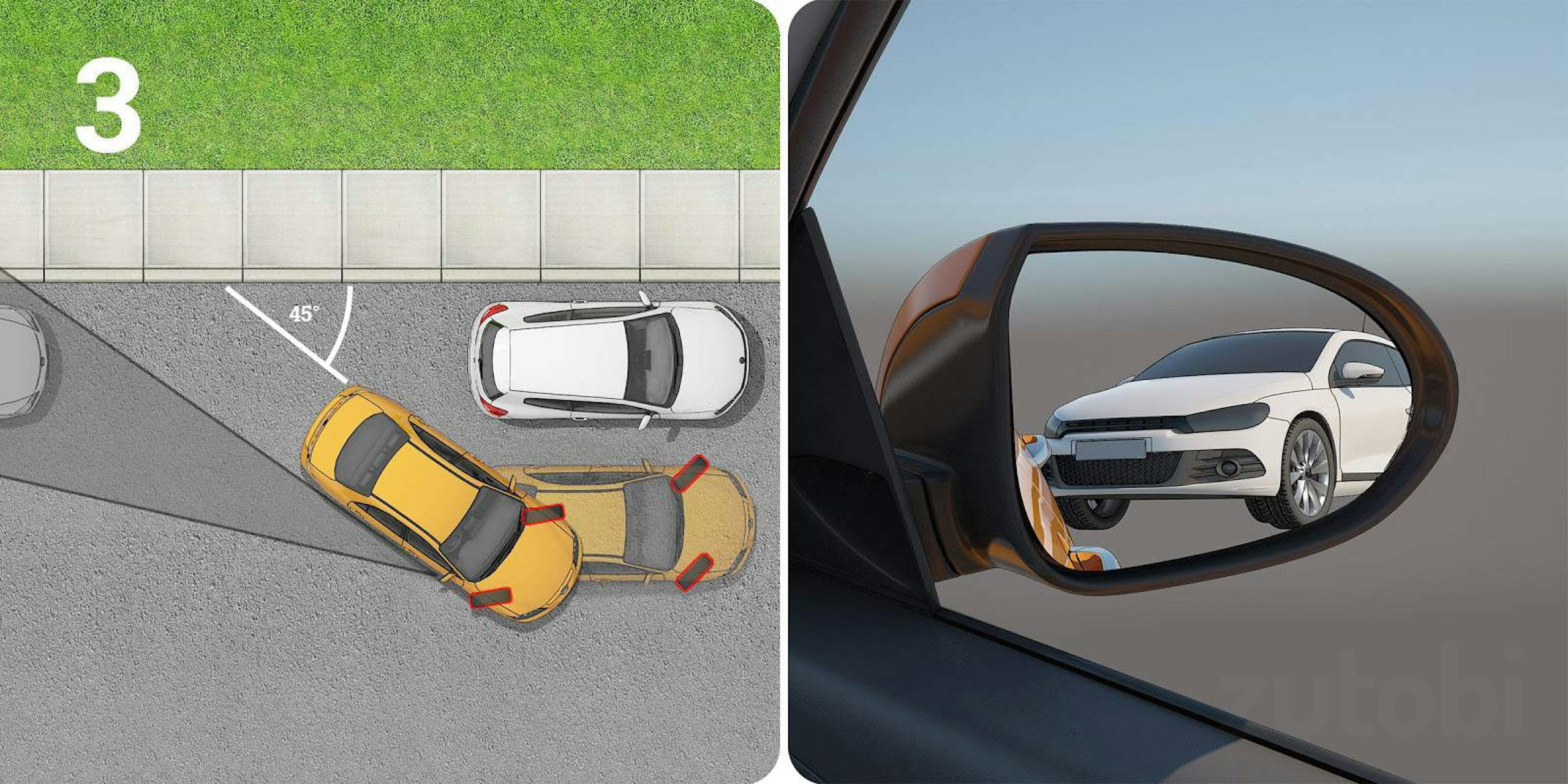 Align your left passenger side mirror with the driver’s side mirror of the car that you intend to park behind. You should be about 0.5m – 1m from the side of the parked car.