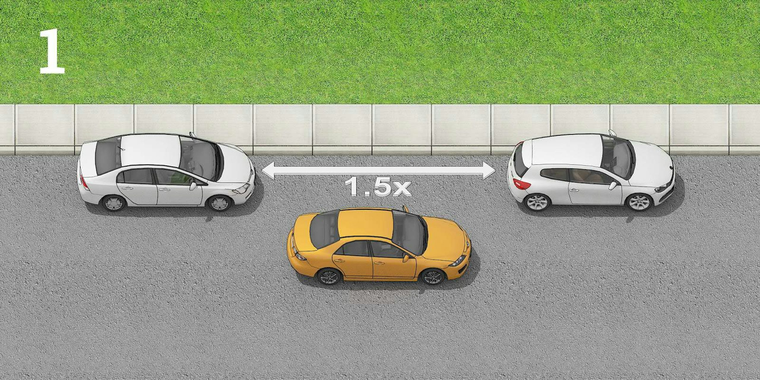 The first thing you need to do is find a large enough parking spot. The gap should be at least 1.5 times the length of your car for you to have enough room to safely perform the parallel parking manoeuvre. More experienced drivers may parallel park with even less space, while less experienced drivers may need a larger gap so they can get in and out.