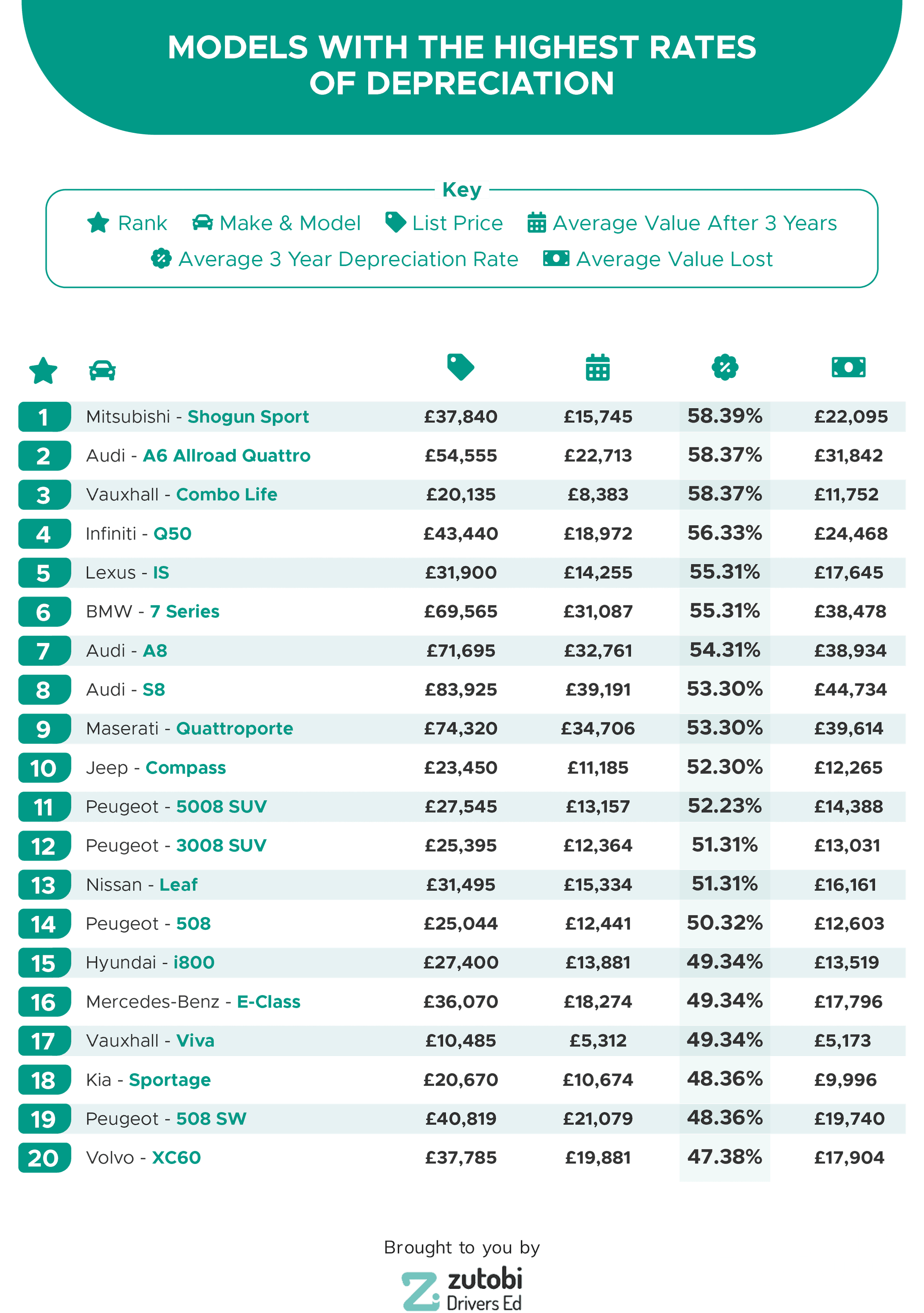 Mitsubishi’s off road vehicle the Shogun Sport is the car with the highest average levels of depreciation in the UK, over three years it will lose 58.39% of its value. This means that if you spent £37,840 on a brand new Shogun, after three years it would only have a comparatively paltry value of £15,745.