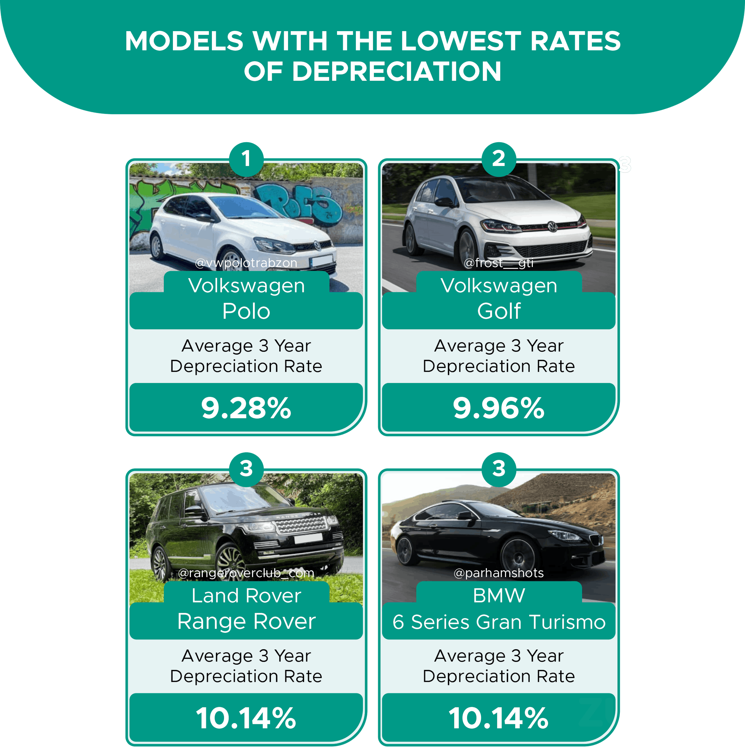 3 – Land Rover Range Rover & BMW 6 Series Gran Turismo, average 3 year depreciation of 10.14%