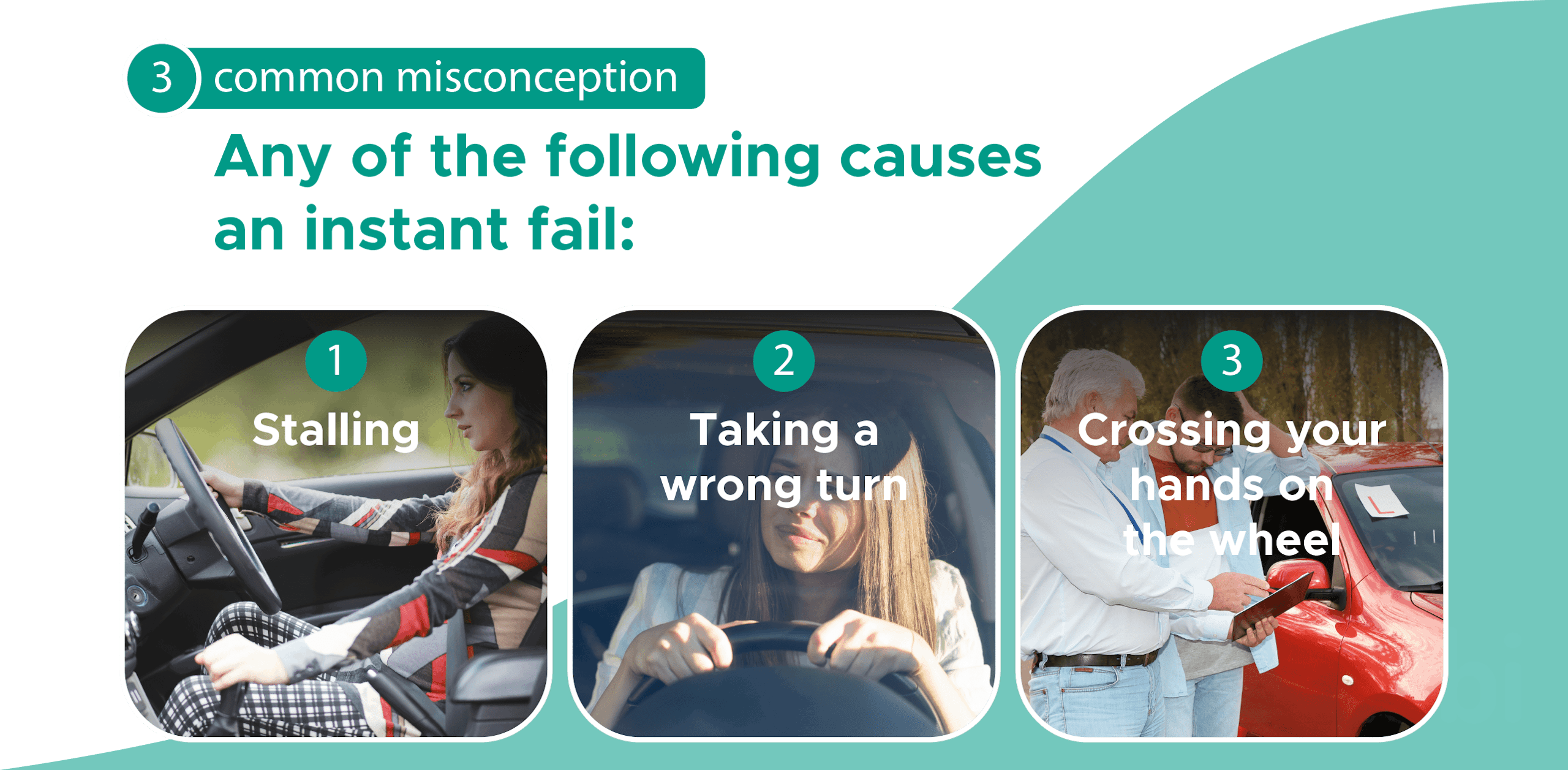 Similarly, there’s a popular myth that crossing your hands on the steering wheel will cause you to immediately fail your test.