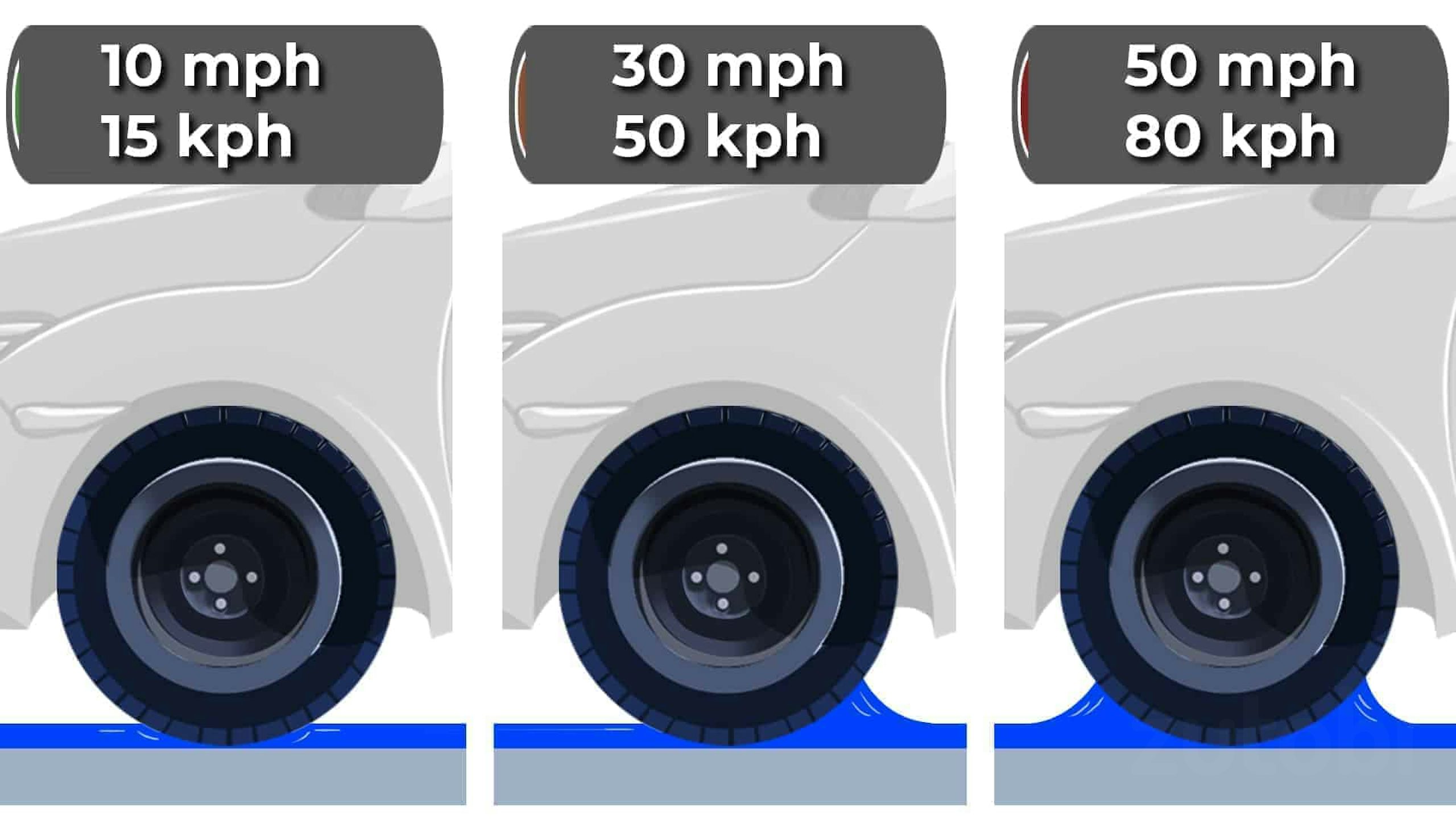 Speed will affect how long your tyres stay in contact with a specific contact point and affect how much water your tyres are able to push away. The faster you drive, the harder it will be for your tyres to push the water away.