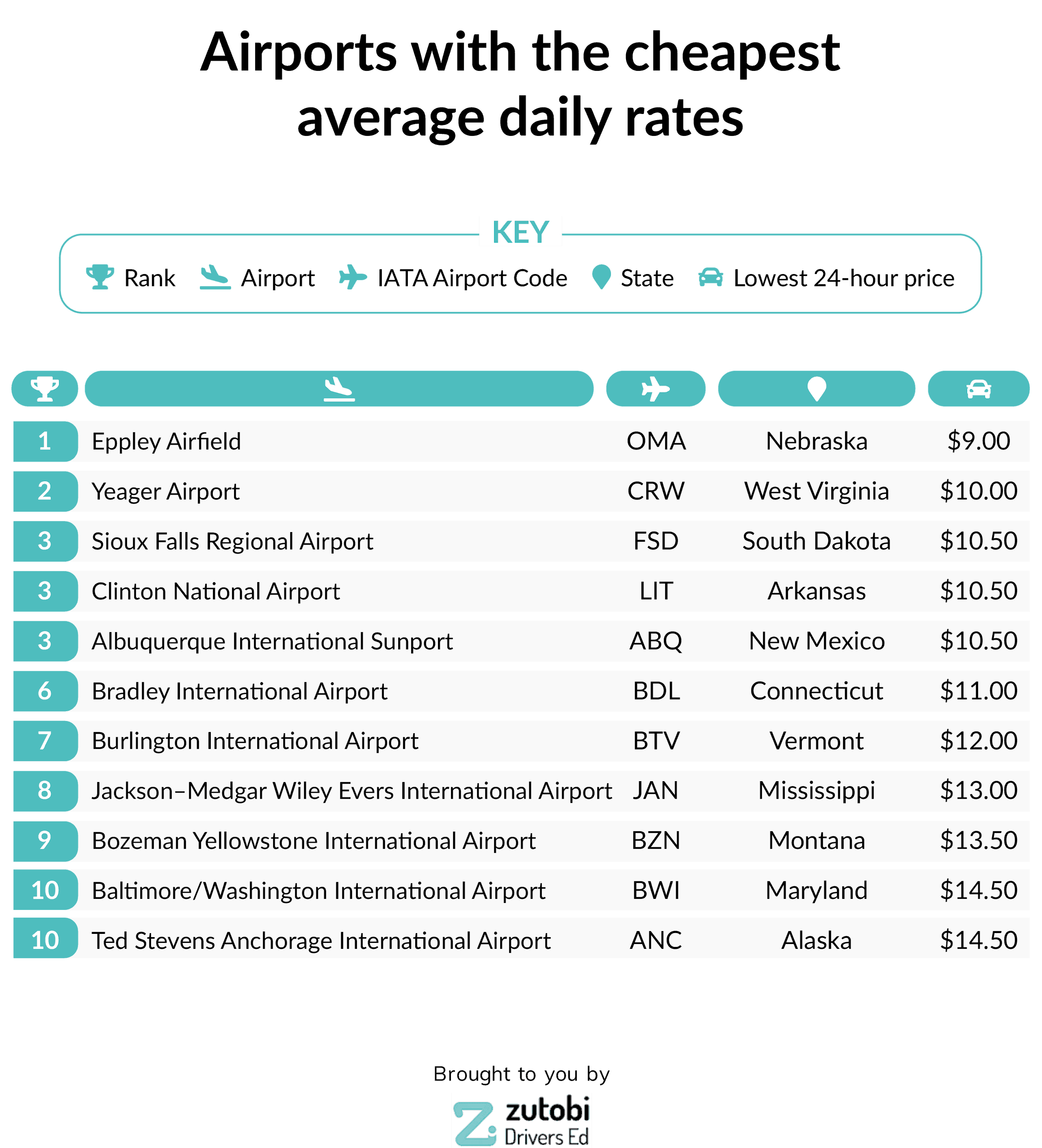 - Sioux Falls Regional Airport (FSD), South Dakota – $10.50 average rate