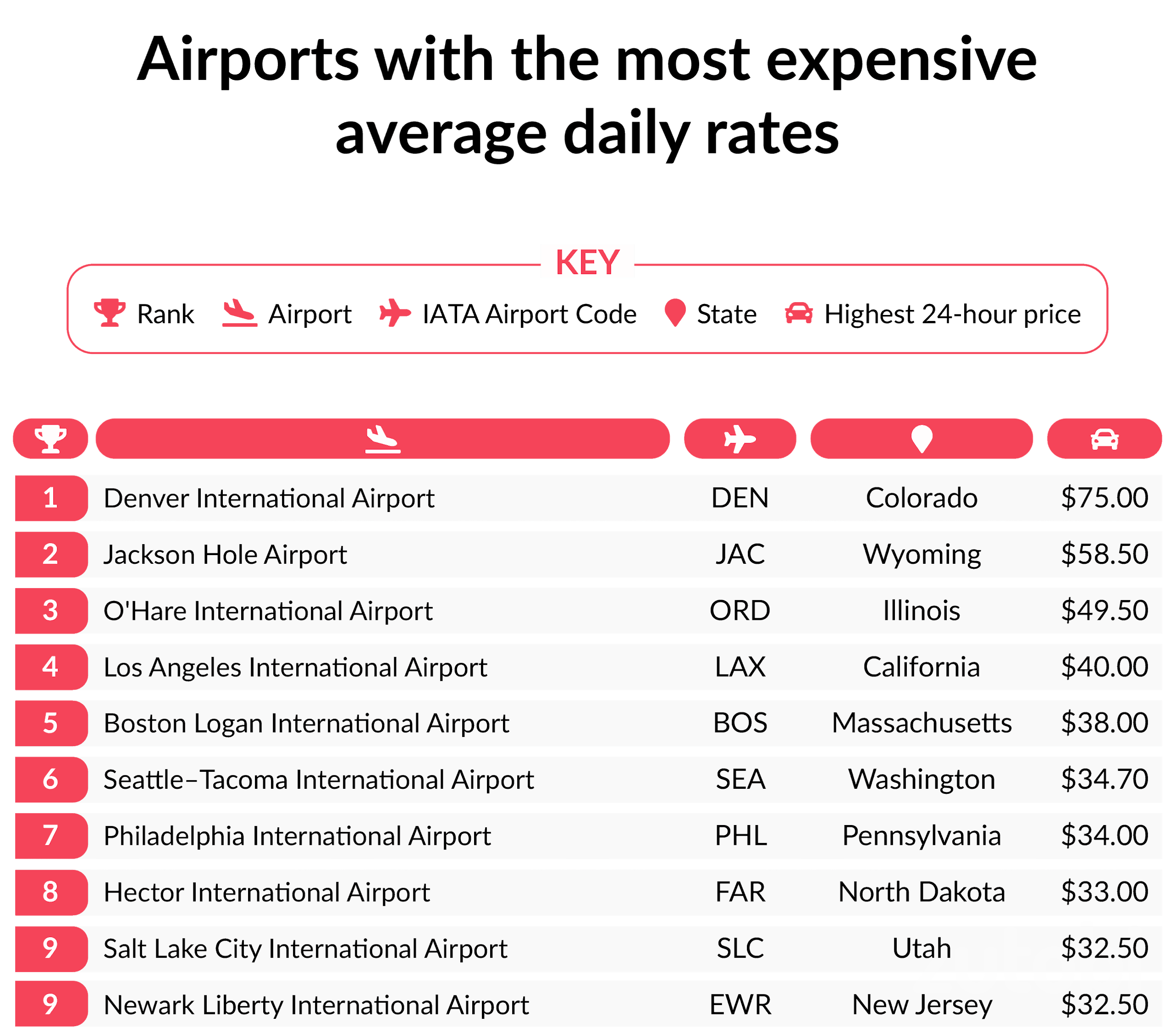 - Albuquerque International Sunport (ABQ), New Mexico – $10.50 average rate