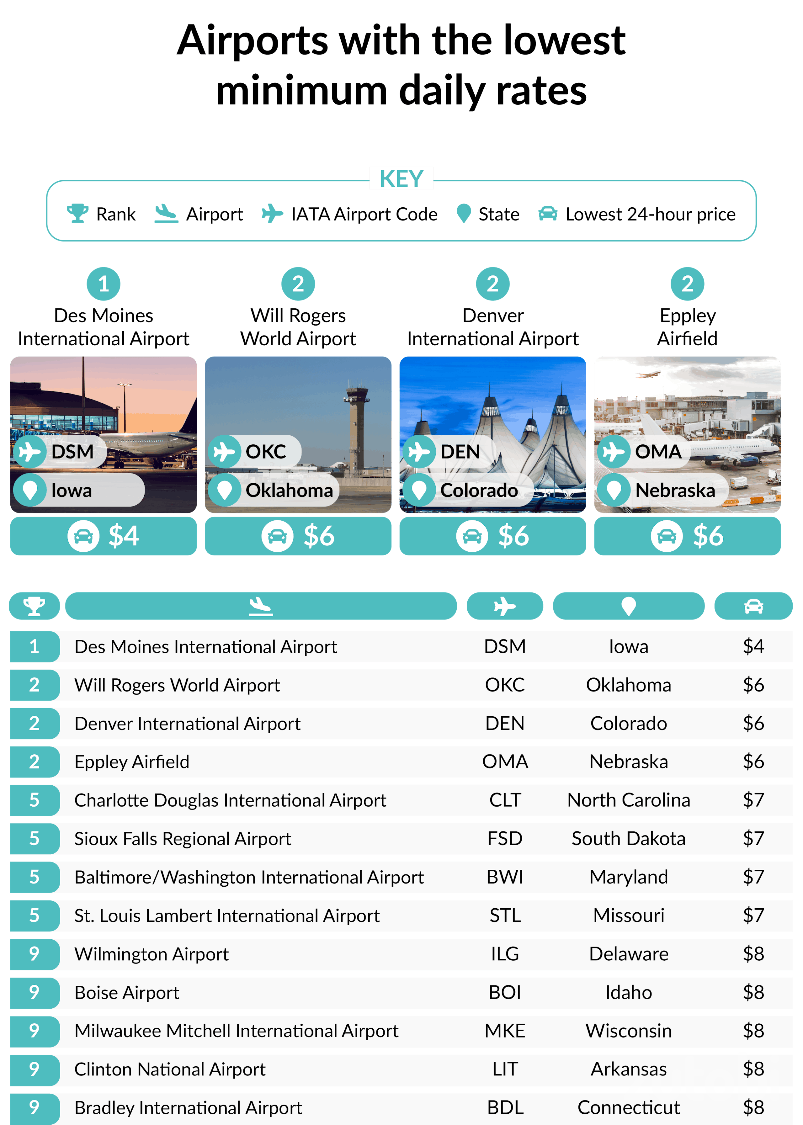 - Will Rogers World Airport (OKC), Oklahoma – $6 minimum daily rate