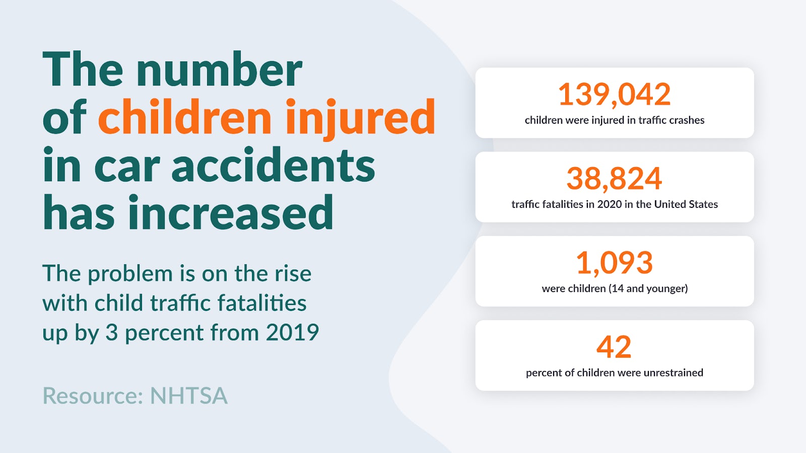 Car crashes are the number one cause of death for children. According to NHTSA, of the 38,824 traffic fatalities in 2020 in the United States, 1,093 were children 14 and younger. An additional 139,042 children were injured in traffic crashes. The problem is on the rise with child traffic fatalities up by 3 percent from 2019.