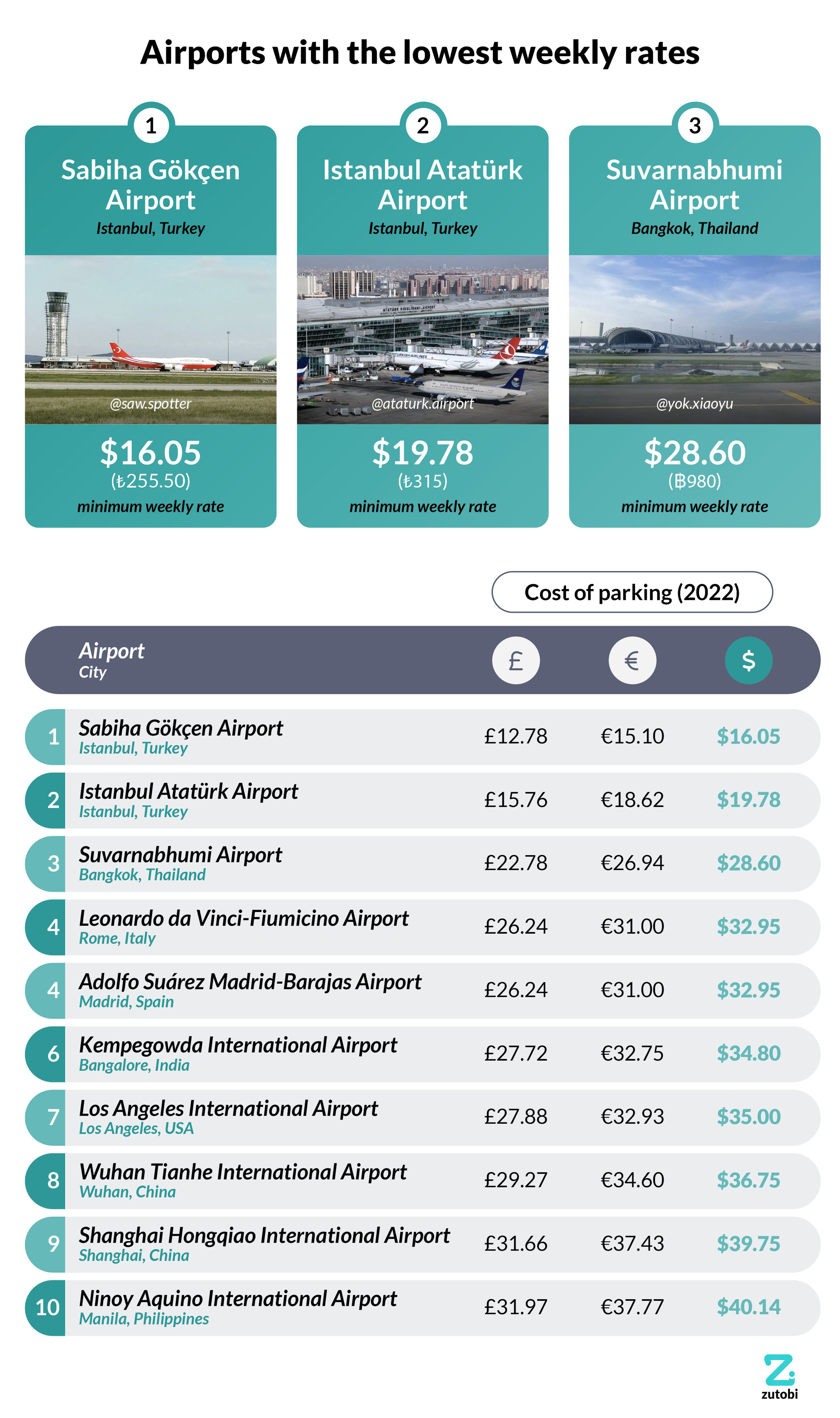 The airport with the lowest daily parking rate is Sabiha Gökçen Airport in Istanbul, where a full week’s parking can cost as little as $16.05. That’s $16 very well spent, as weekly parking rates vary wildly depending on the airport and where you park.