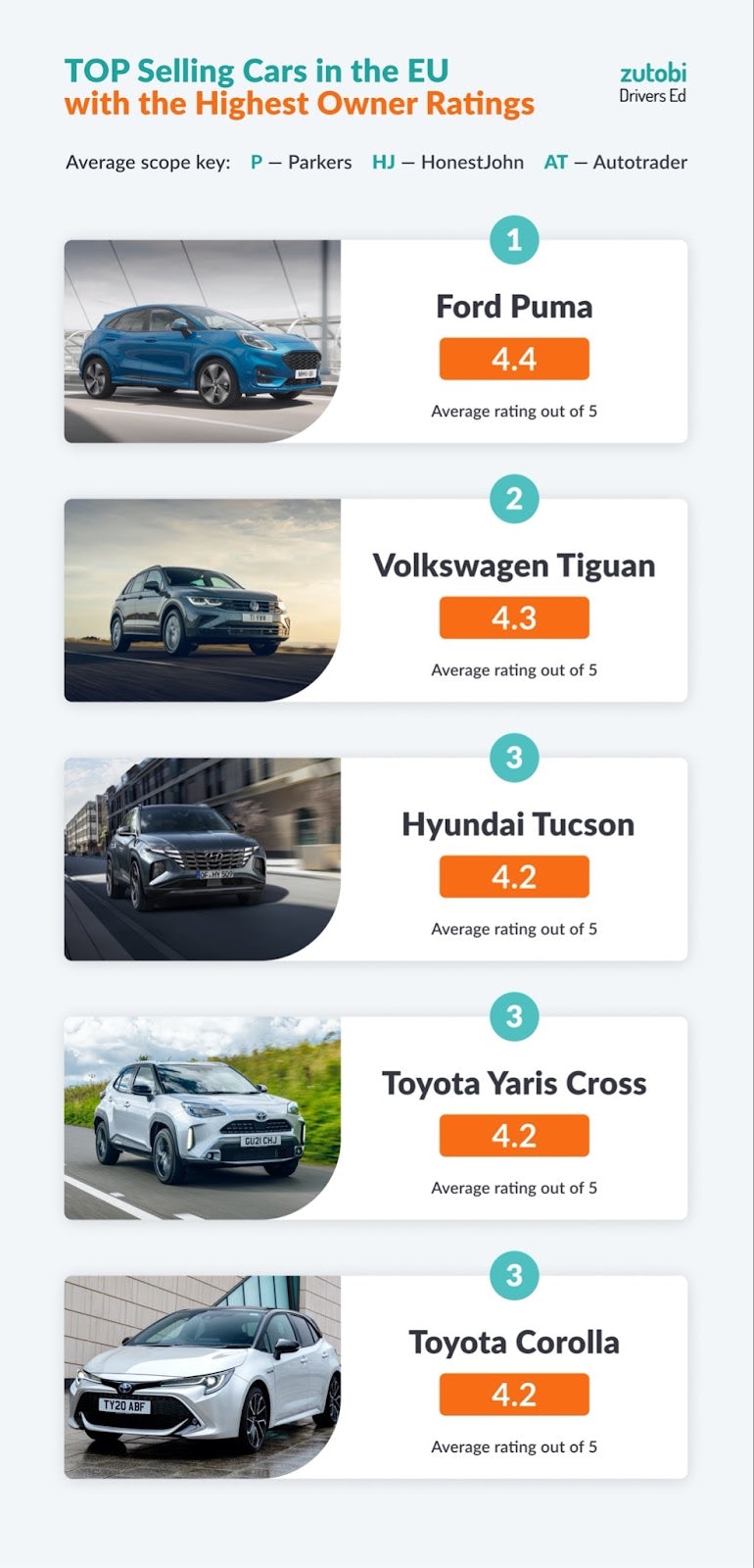 Best known as a small family car, the Ford Puma topped the list for European car owners. Both HonestJohn and Parker’s awarded this vehicle a 4.6 rating with AutoTrader owners coming in at 4. This resulted in an impressive average score of 4.4.