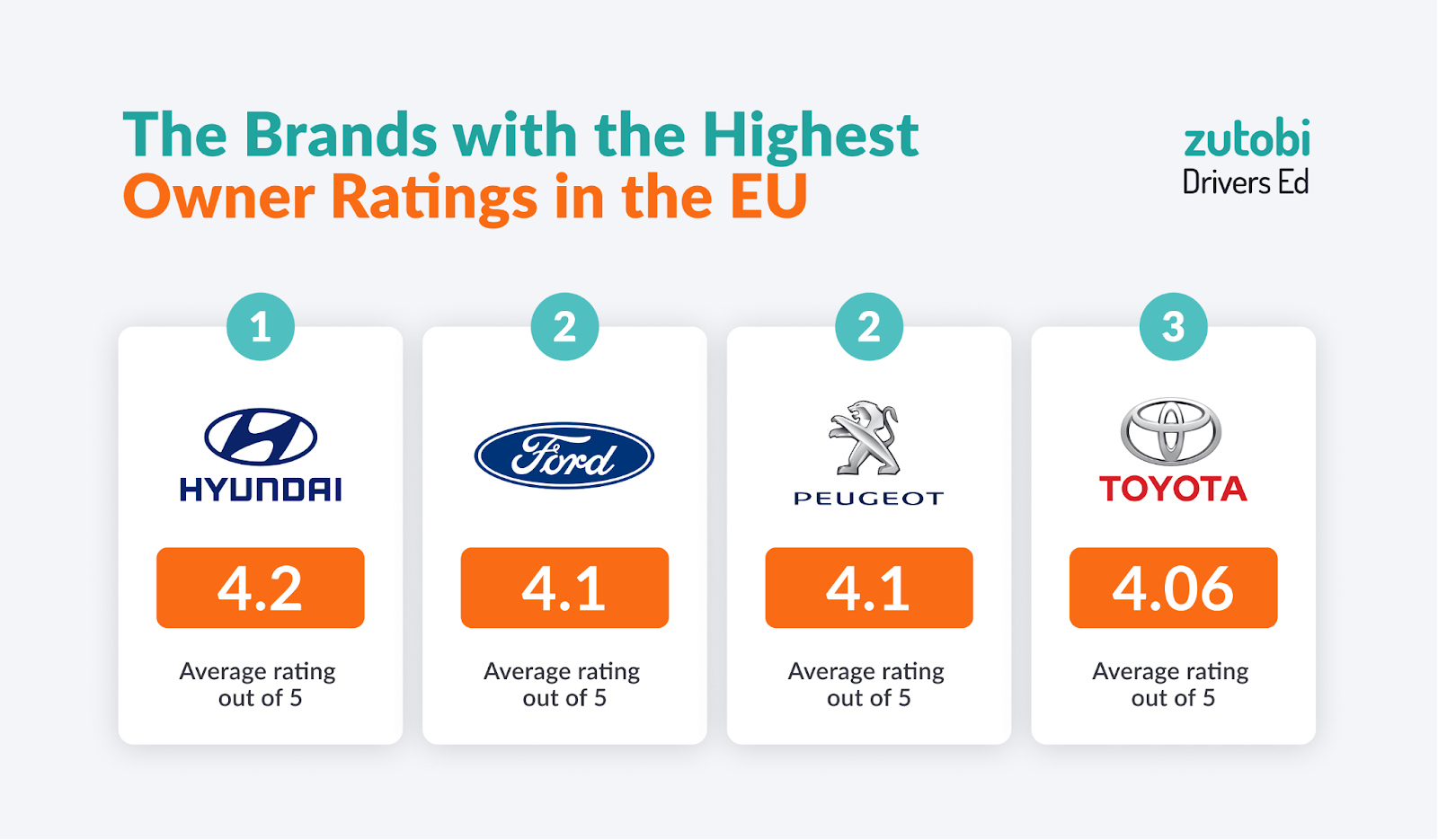 When we looked at the top car brands in Europe, several popular ones came out on top for current owners. Hyundai vehicles scored an impressive 4.2 out of 5, followed by Ford and Peugeot that tied at 4.1. Toyota brought up the rear just a tad behind at 4.06.