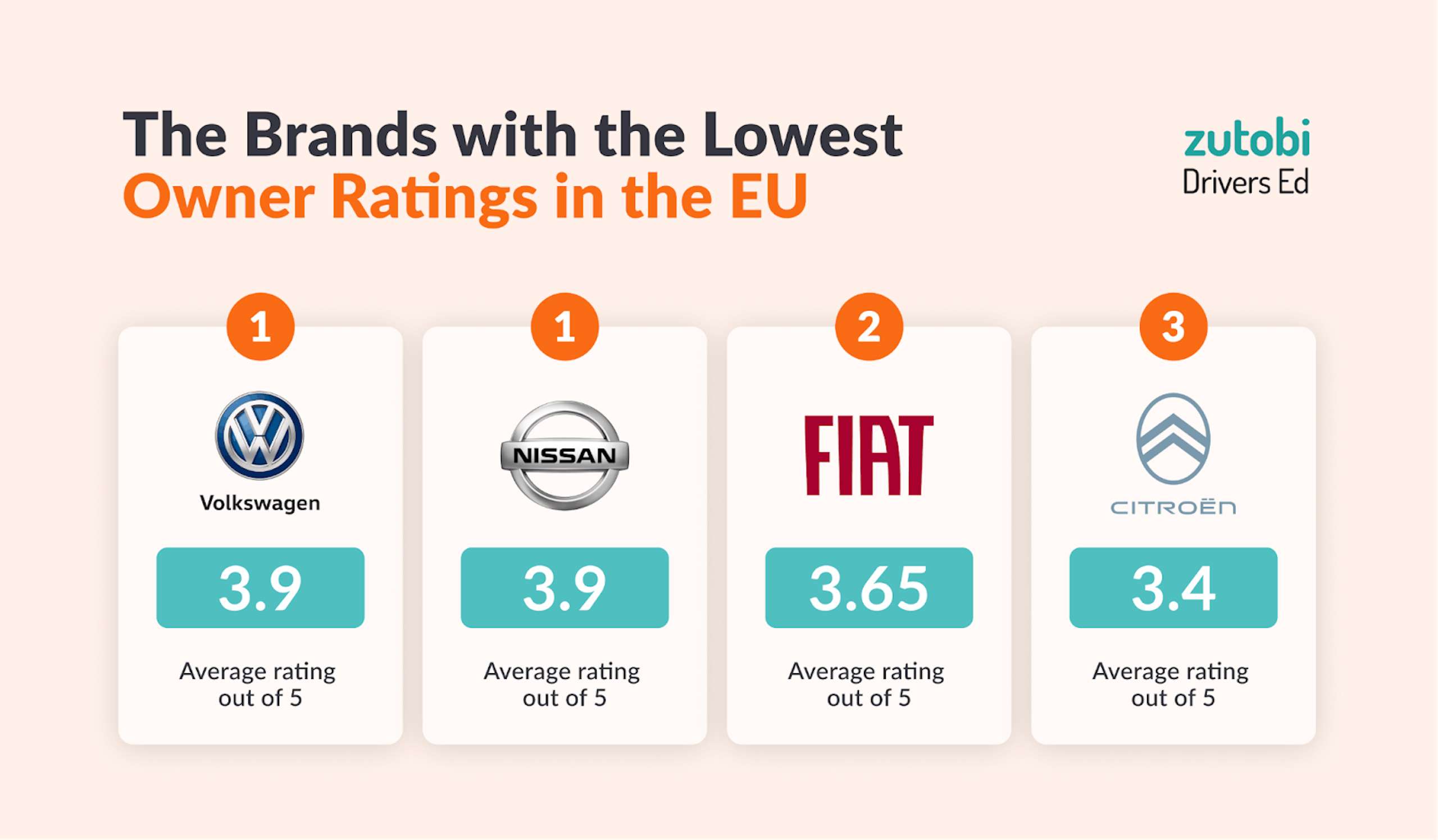 At the other end of the spectrum, we found that owners placed Citroen at the bottom with a score of 3.4, Fiat at 3.65, and both Volkswagen and Nissan at 3.9.