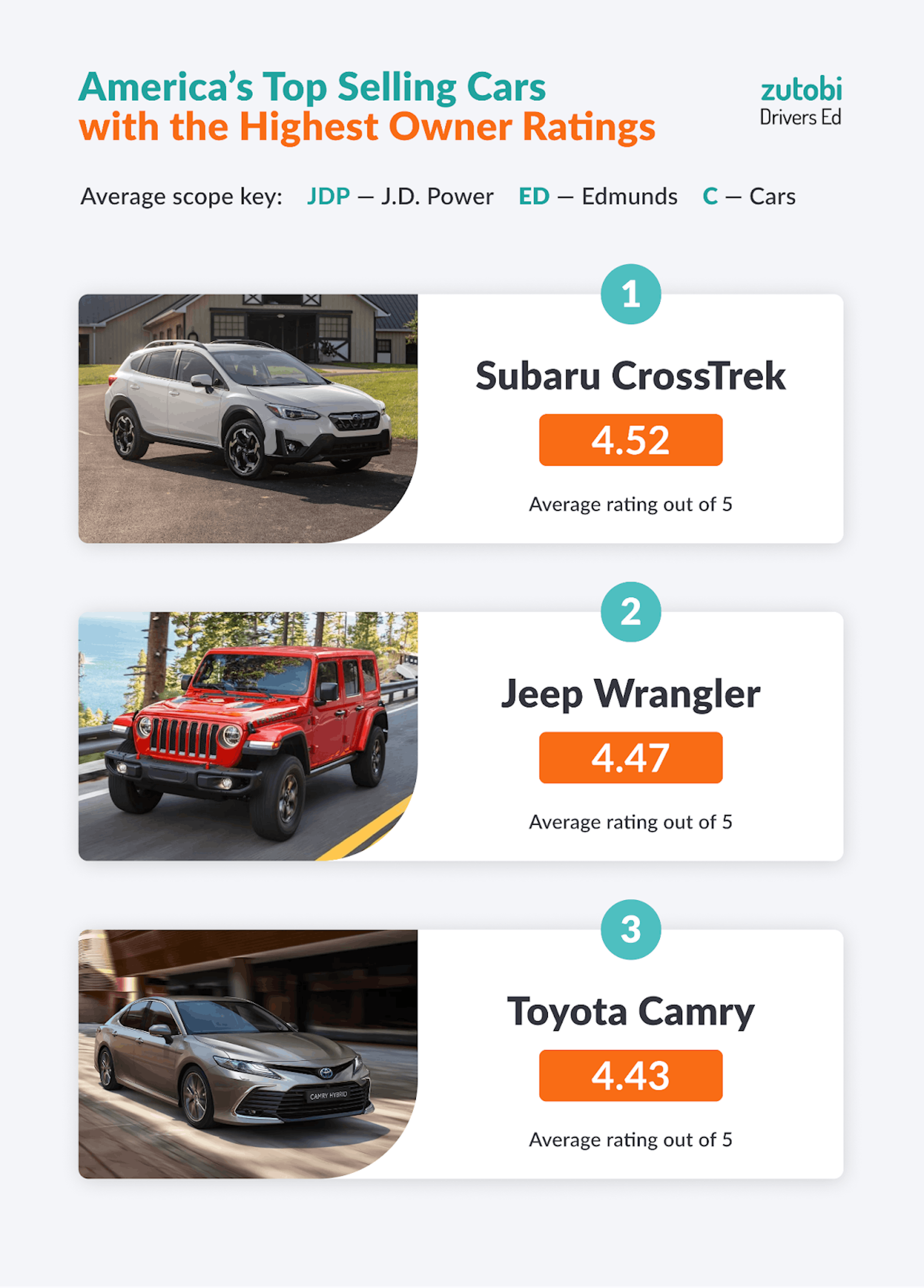 Well-known since its inception in 1986, this compact, mid-size four-wheel drive off-road SUV came in second. Earning an average rating of 4.47, the Jeep Wrangler impressed Cars.com owners and achieved a 4.8 rating, which tied with the first place vehicle.
