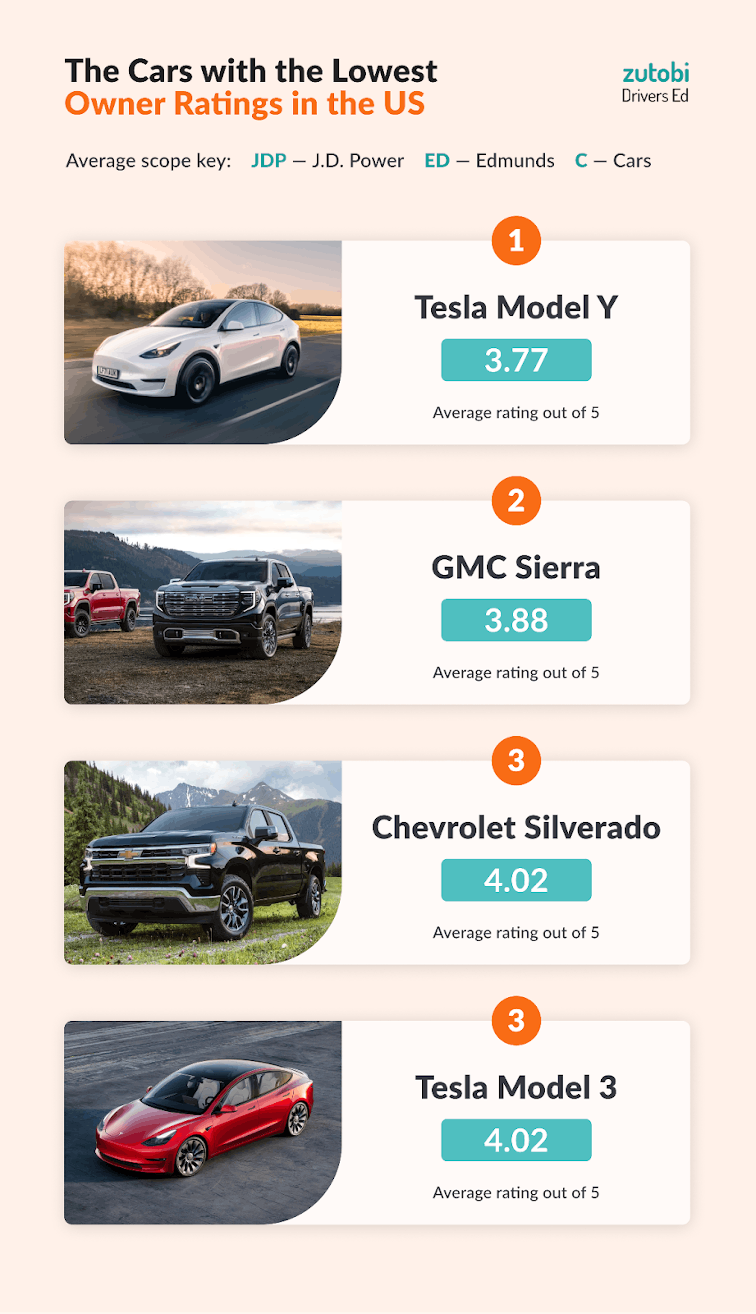 Tying with the Chevrolet Silverado is the Tesla Model 3, also coming in at a 4.02. This fully electric car had respectable ratings of 3.9, 4, and 4.2 from J.D. Power, Edmunds, and Cars.com, respectively.