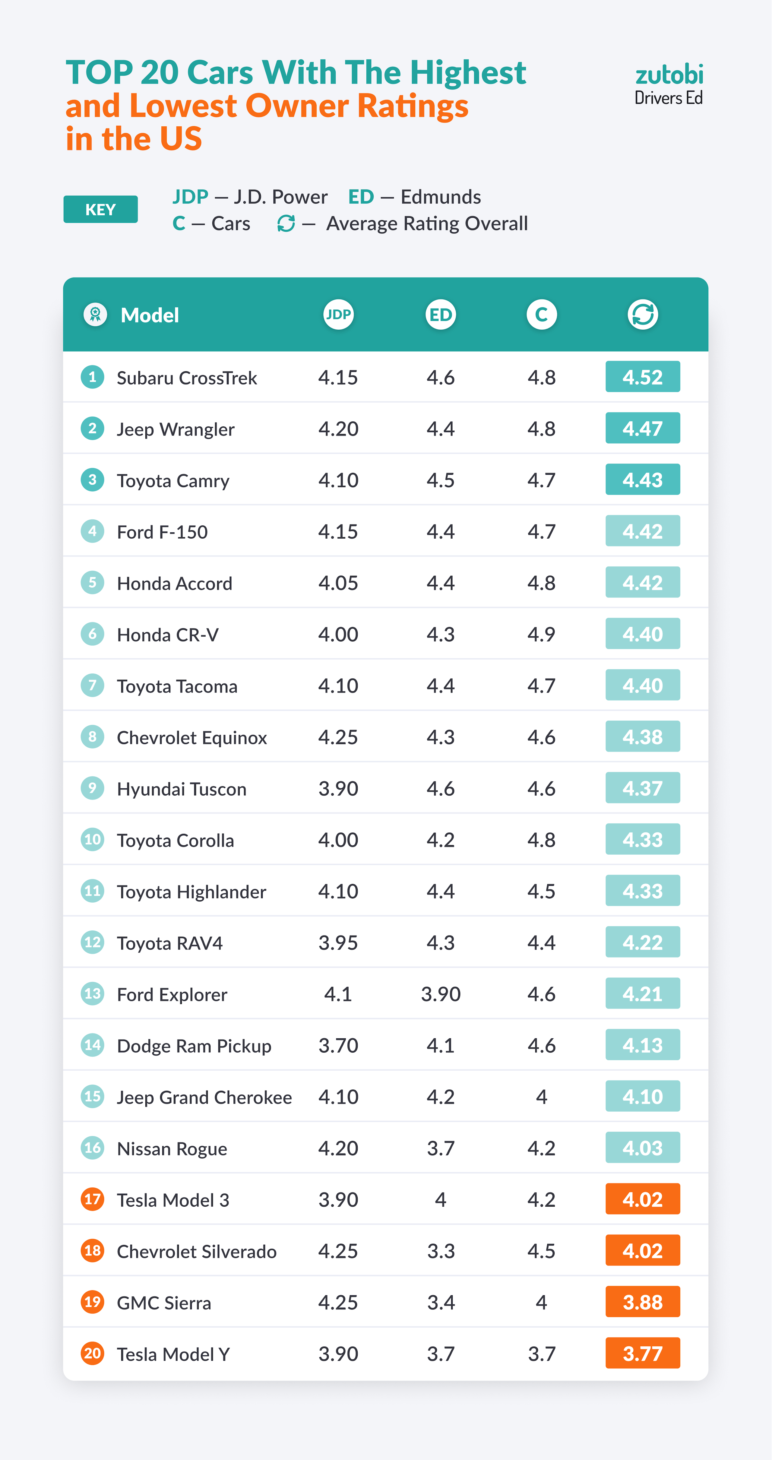 TOP 20 Cars with the Highest and Lowest Owner Ratings in the US
