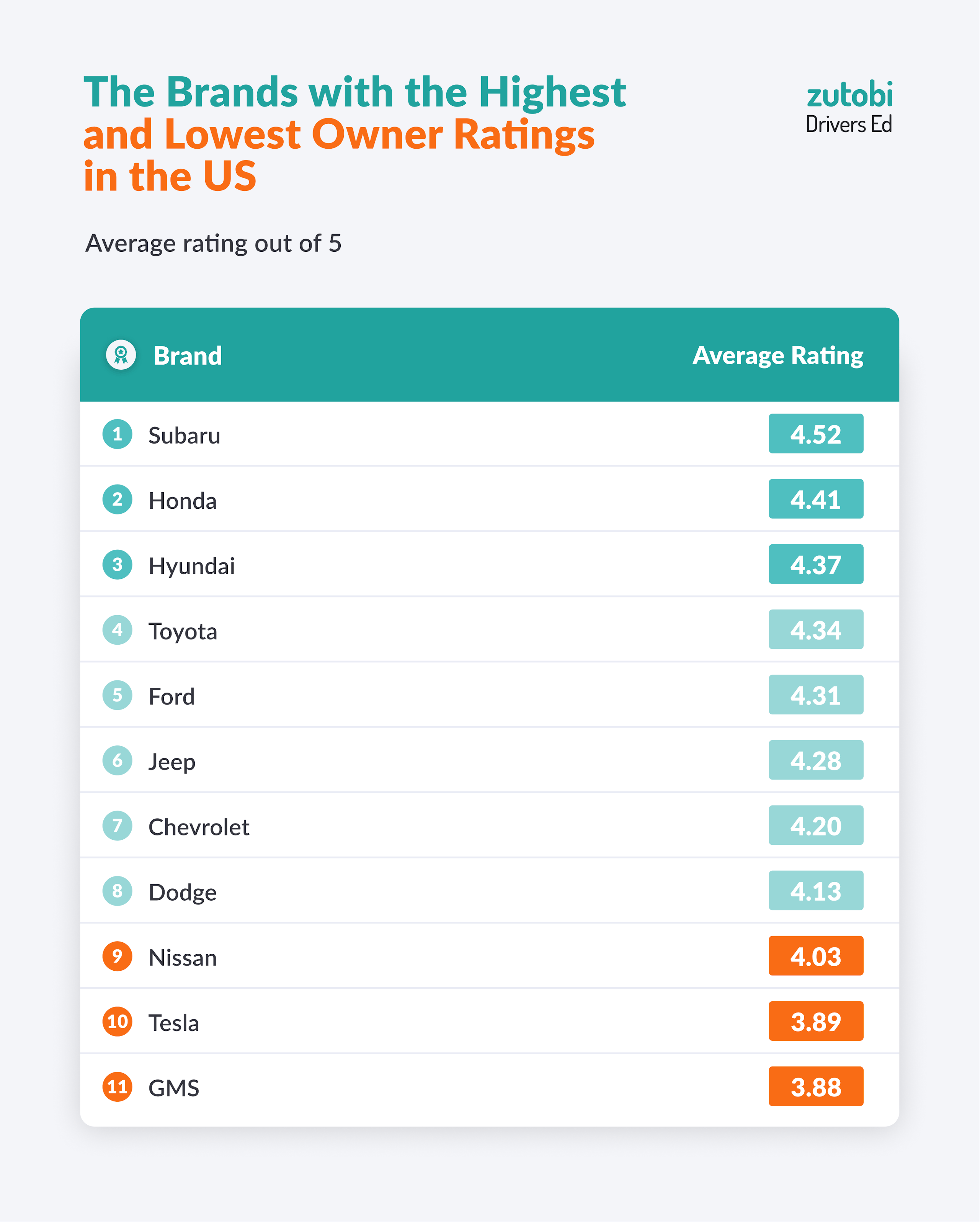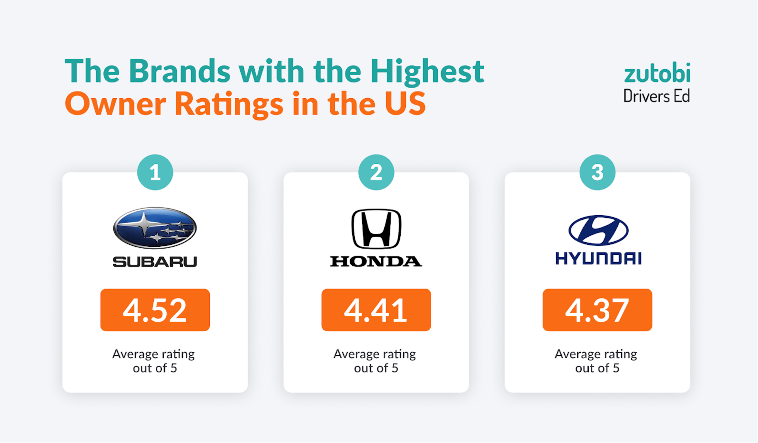 Current owners rated Subaru, Honda, and Hyundai as the top car brands in the United States with scores of 4.52, 4.41, and 4.37, respectively.