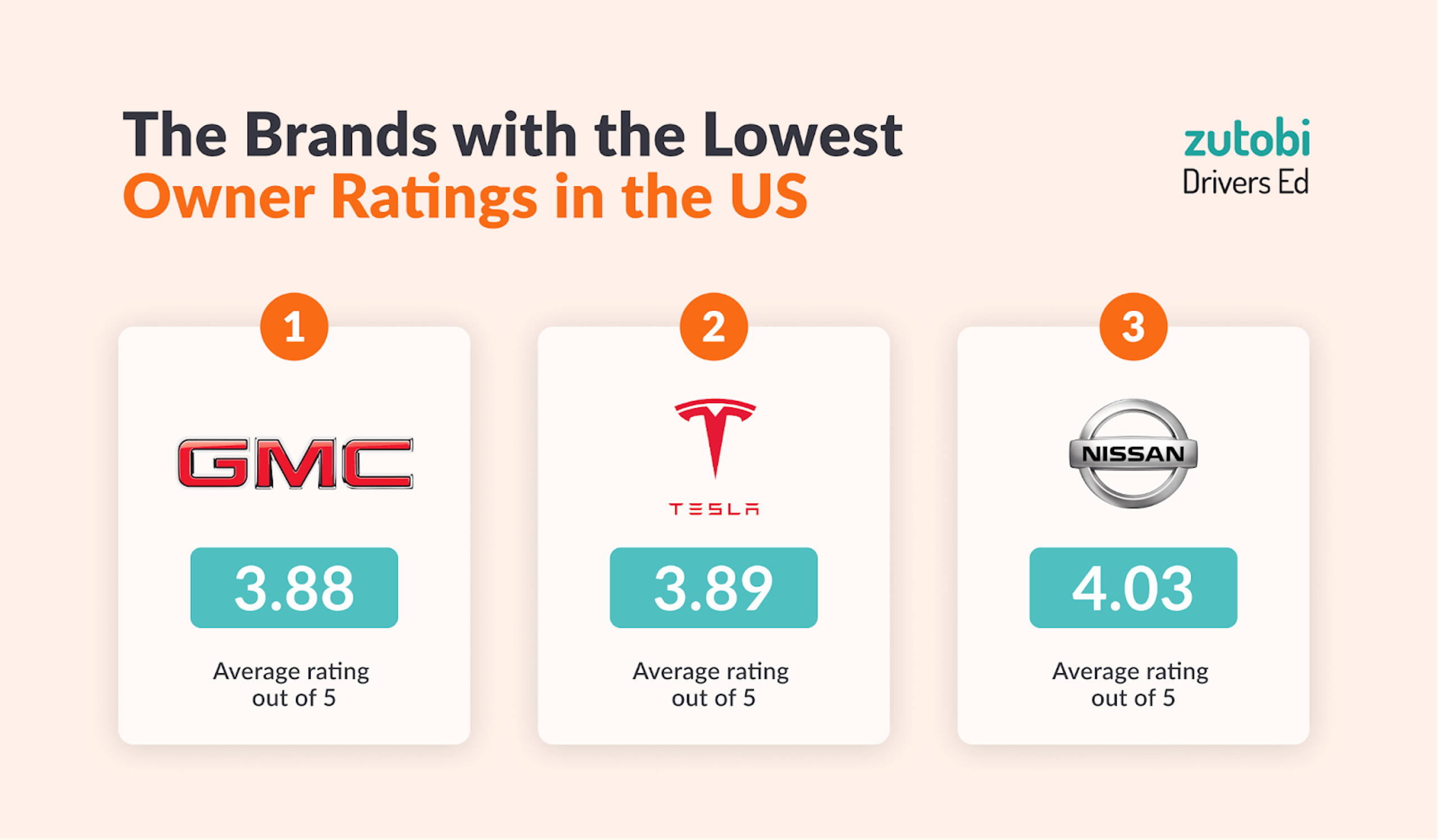 Although Nissan, Tesla and GMC brought up the rear in our survey of U.S. car brands, they still registered reasonable owner scores. Nissan came it at 4.03, Tesla at 3.89, and GMC at 3.88.