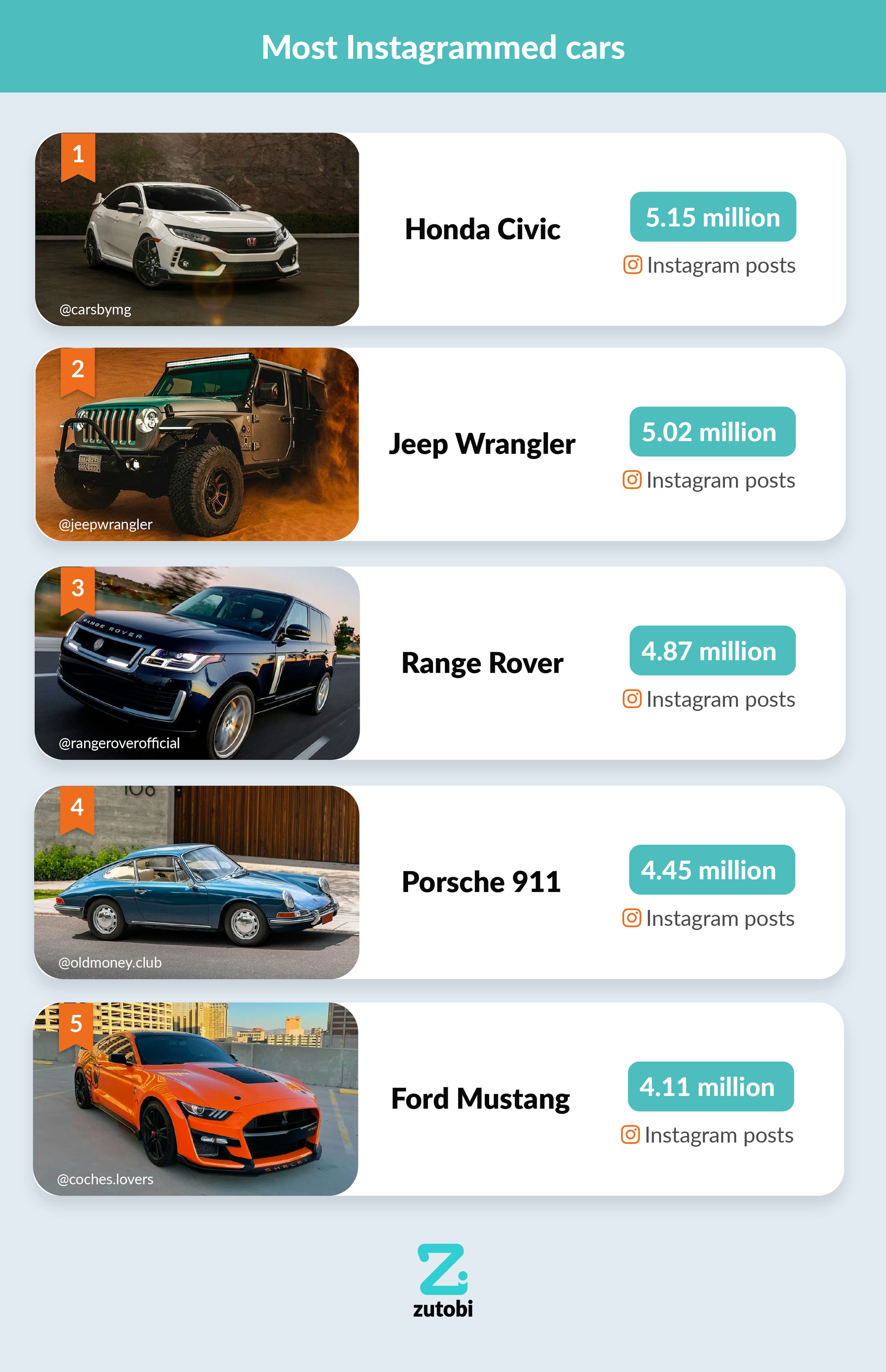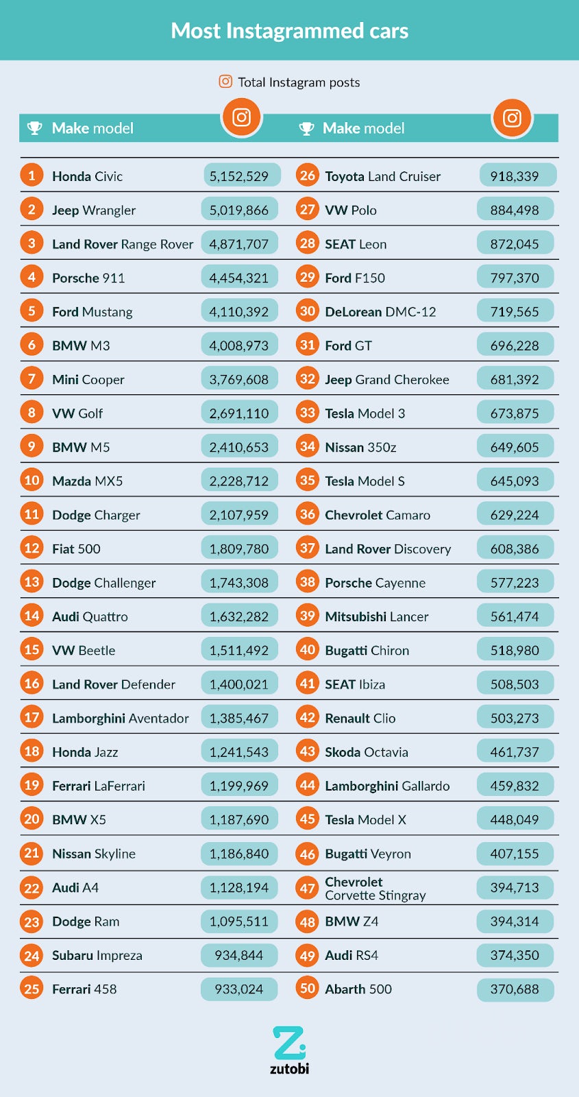 - We compiled a list of cars both new and old and searched the hashtag on Instagram to discover the number of posts they featured in.