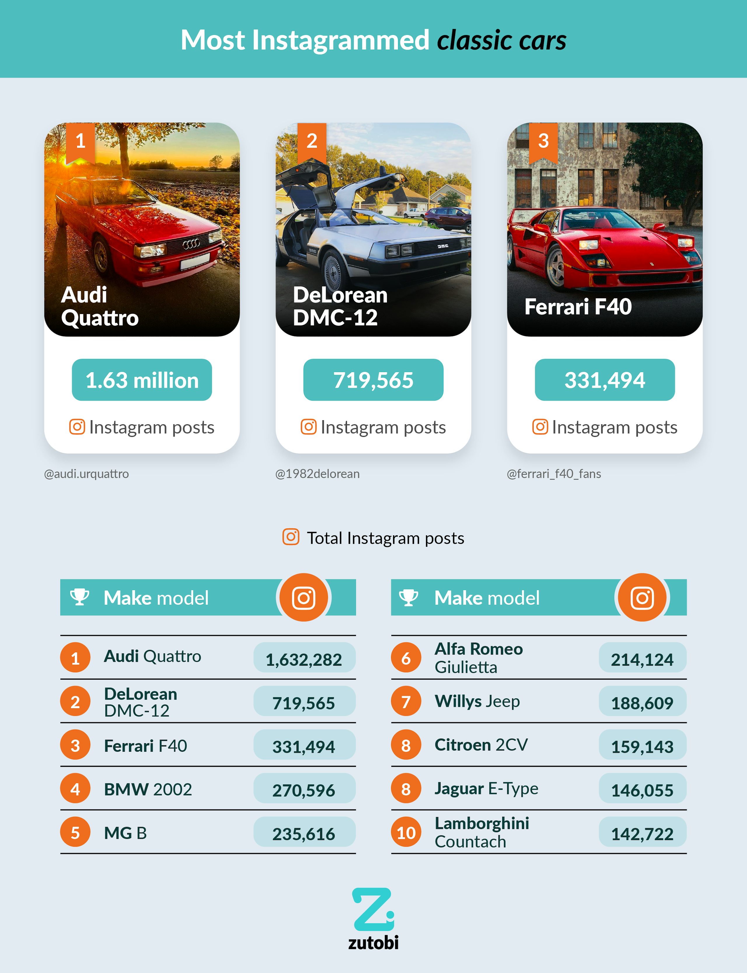 The Audi Quattro was famous in the 1980s for winning the world rally championship, courtesy of its four-wheel drive system. It also had an iconic shape which translated to the road-going versions, this history and those looks have meant it is the only classic car to feature in more than a million Instagram posts.