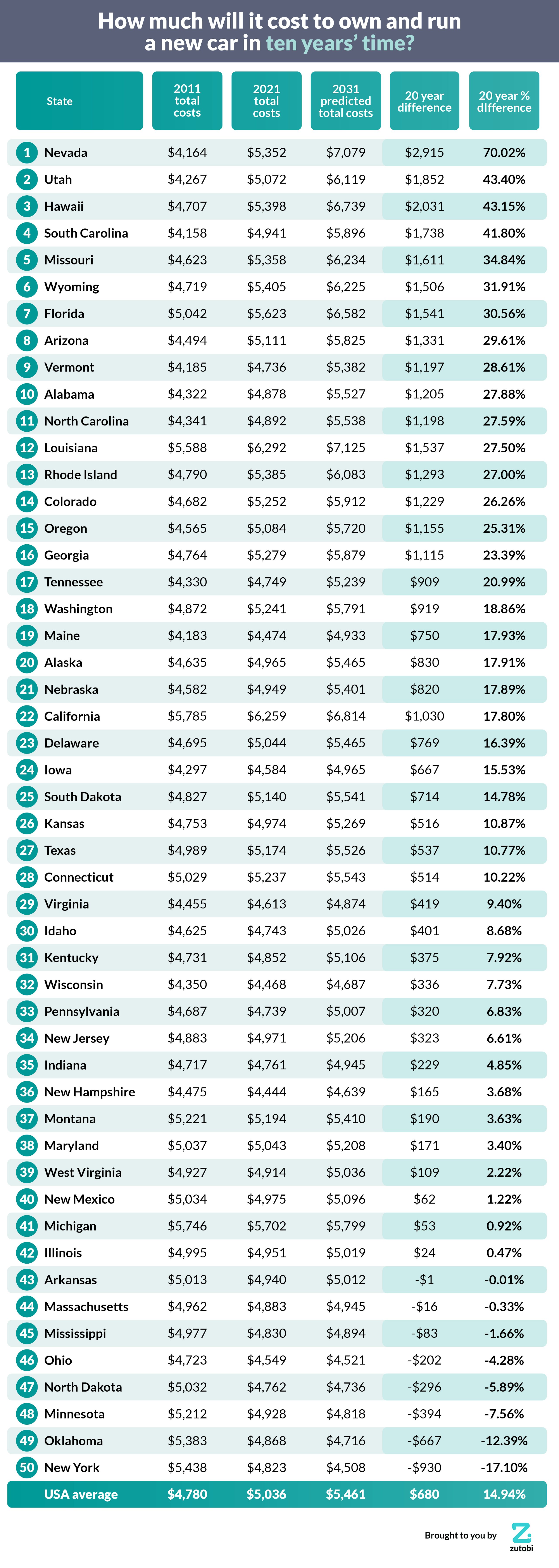 Today in 2021 California is the second most expensive state to own and run a car for six years, but in the next decade, they will have dropped to third (although costs will still increase by over $500). The golden state is only around $300 cheaper than Louisiana but the gap is increasing.