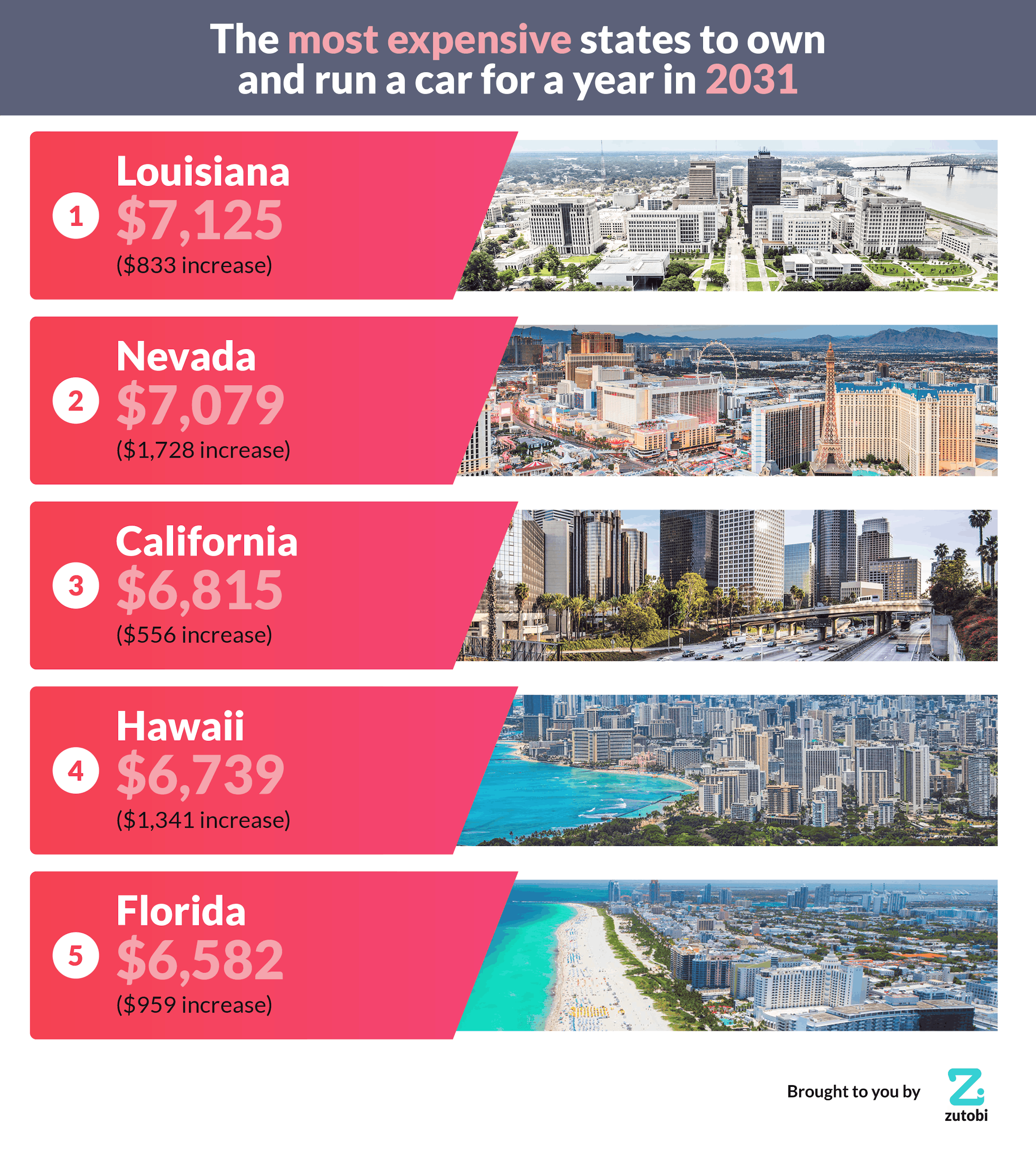 The state that will have usurped California and will be the most expensive place to own and run a car in 2031 will be the Southern coastal state of Louisiana. It will cost just over $7,000 which is over a $800 increase from the current costs of $6,292, Louisiana will also have the current highest average insurance rates, $3,286 in 2031.