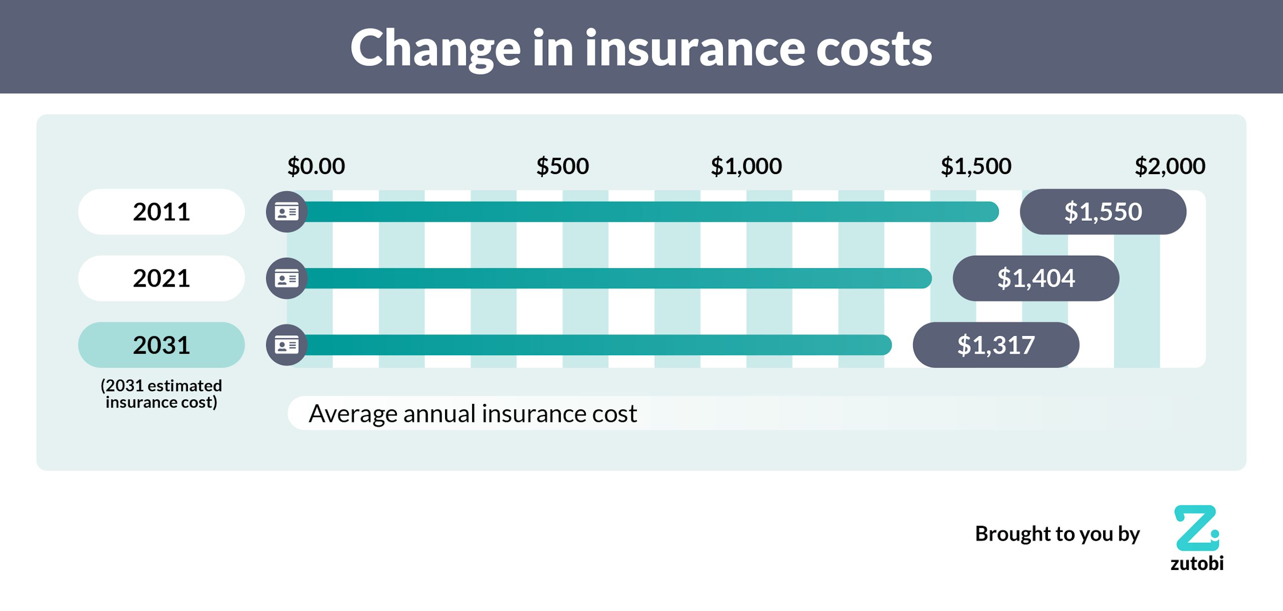 Whilst fuel prices are on the rise across the country, average insurance premiums are actually reducing in the United States. The average cost of insurance in 2011 was $1,550 per annum, which is $145 more than the average cost today of $1,404, when applying this to the future predictions we discover that there is a 9.4% decrease which would result in estimated costs of $1,317 in ten years time.