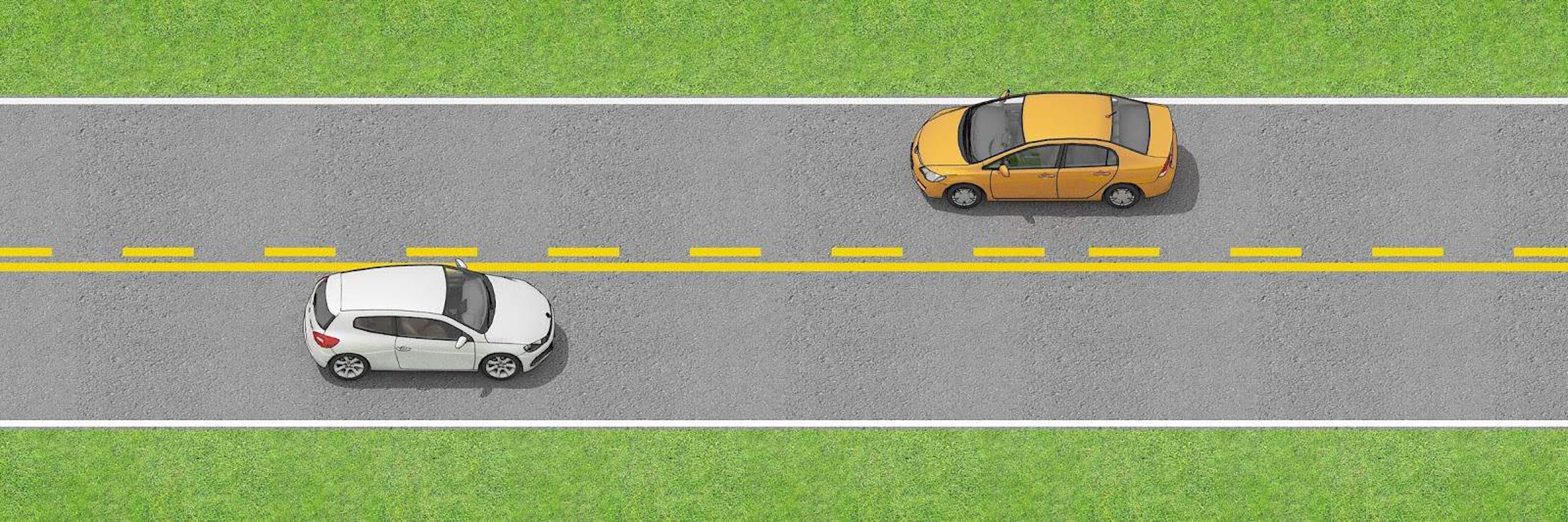 If safe, you may cross broken yellow lines to pass a vehicle in front. Make sure that the road ahead is clear before passing.