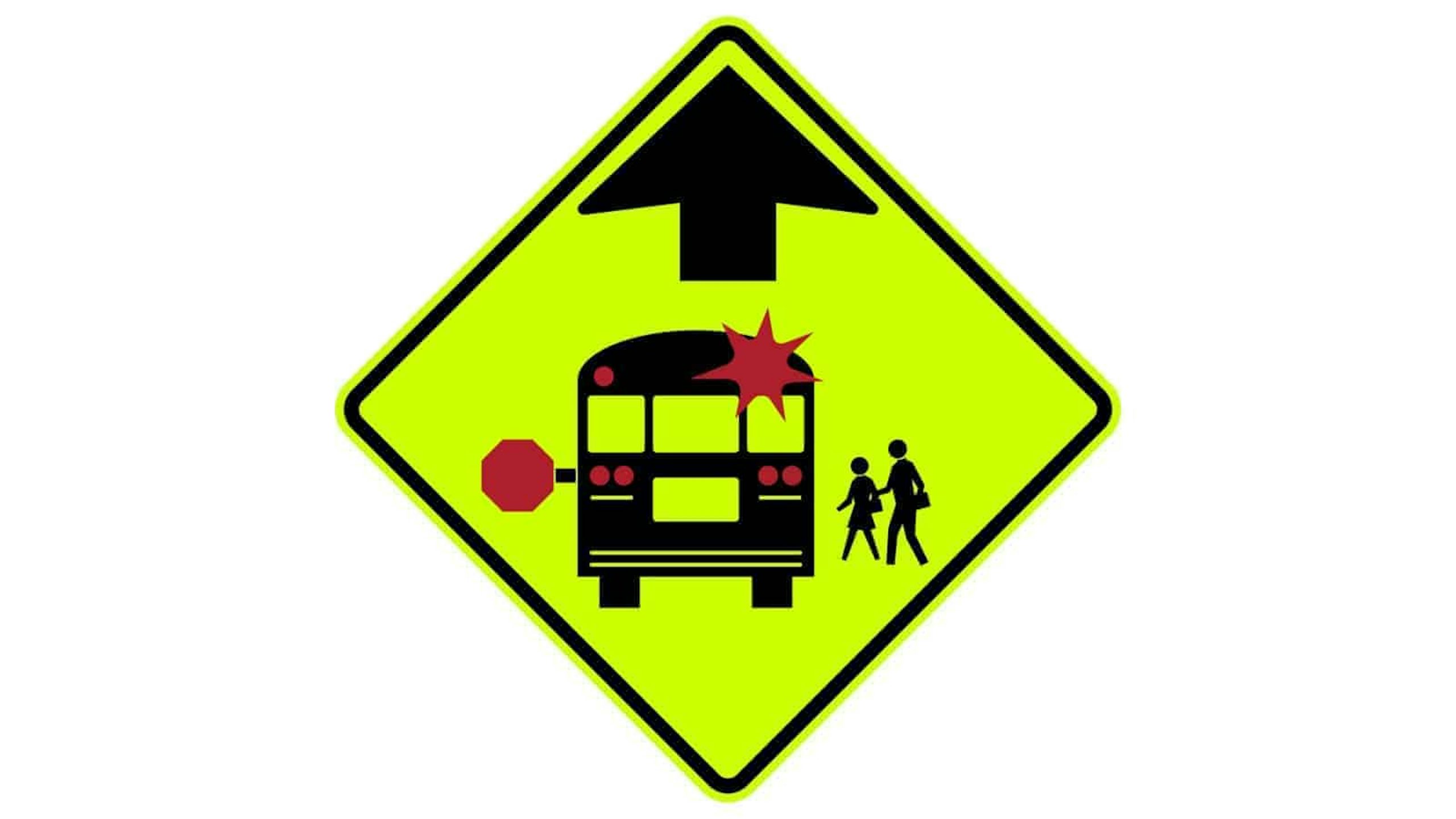School Bus Stop Ahead. This sign warns of a school bus stop ahead. Proceed carefully, especially during just before/after school hours.