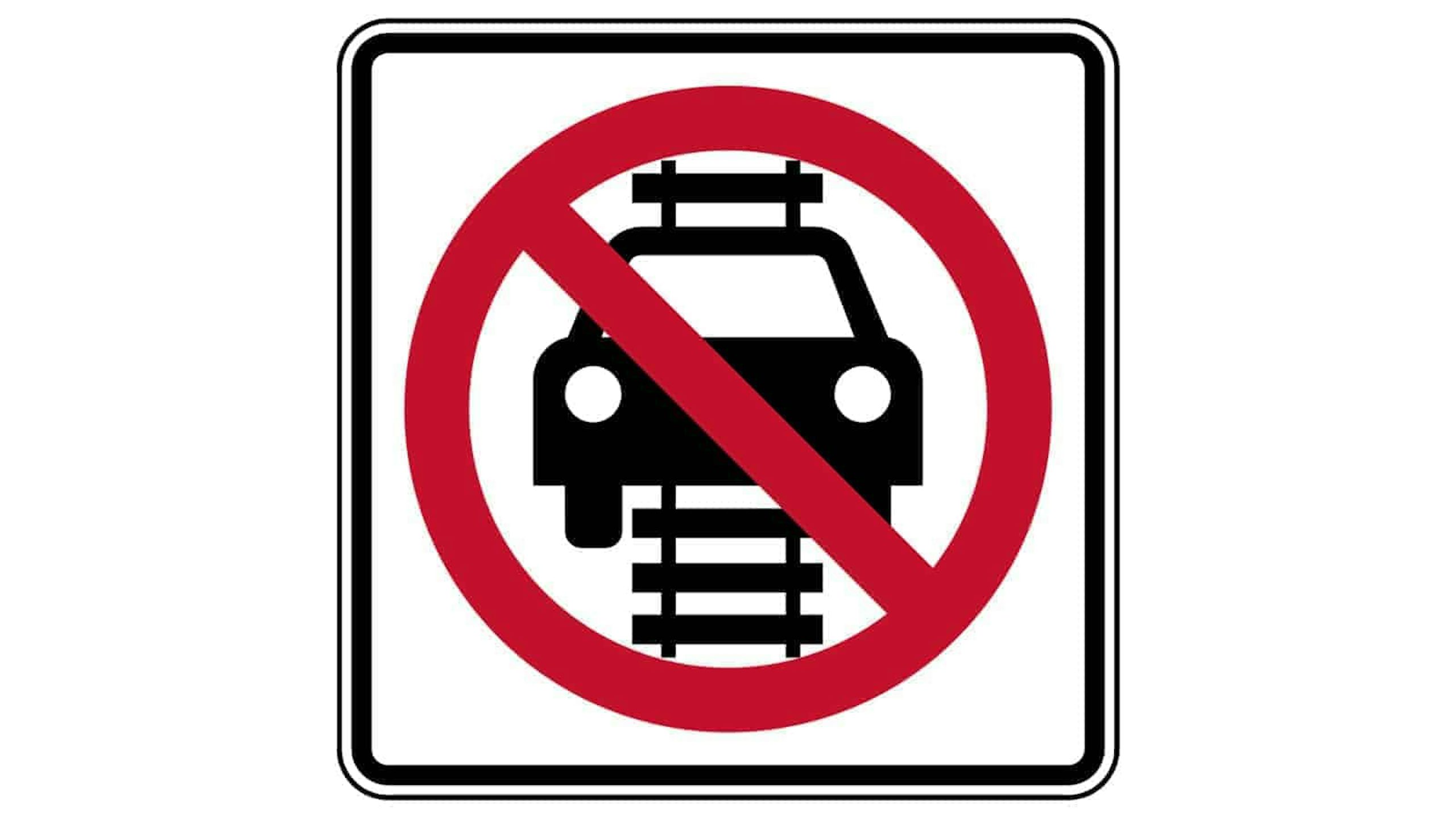 No Driving on Railroad Tracks. This sign indicates that driving is prohibited on the railroad tracks.