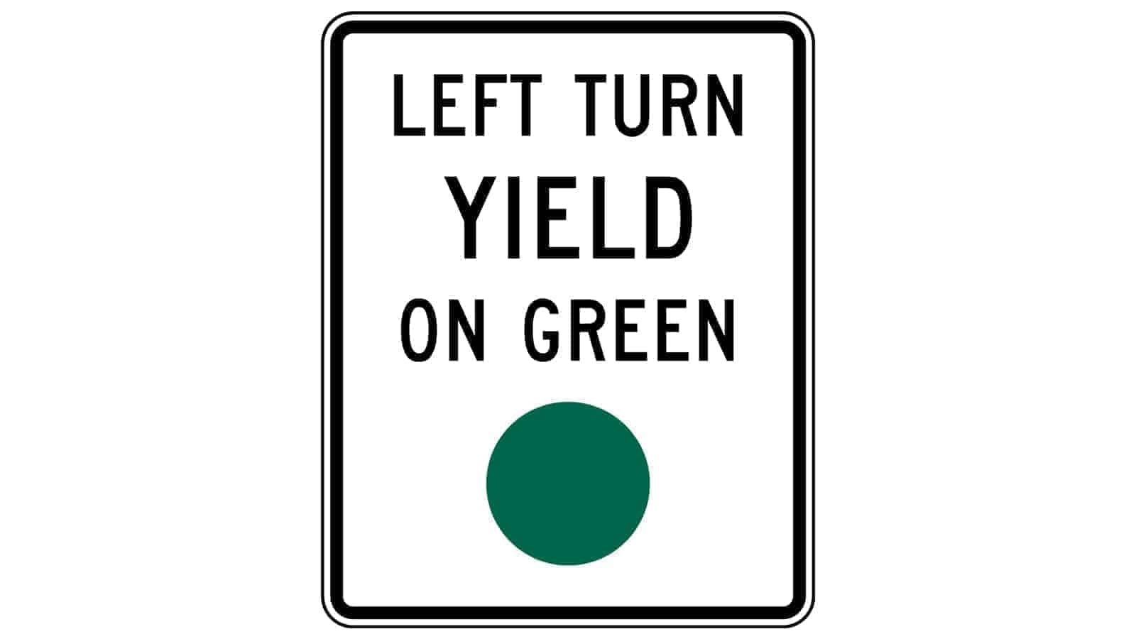 Left Turn Yield on Green Sign. This regulatory sign indicates that all drivers turning left on a green light must yield.