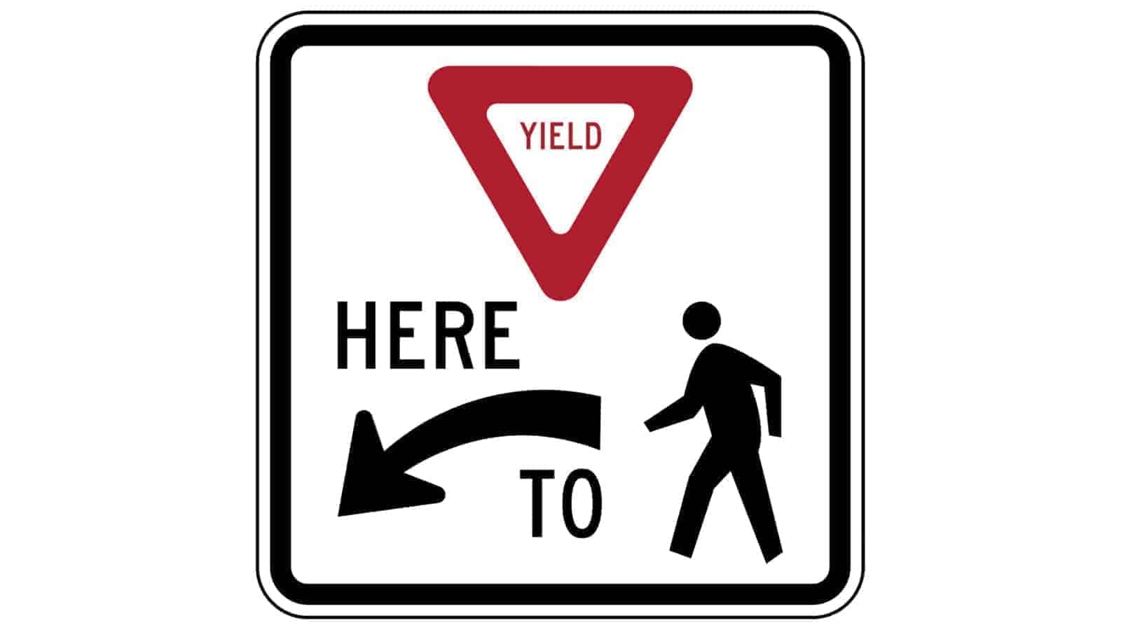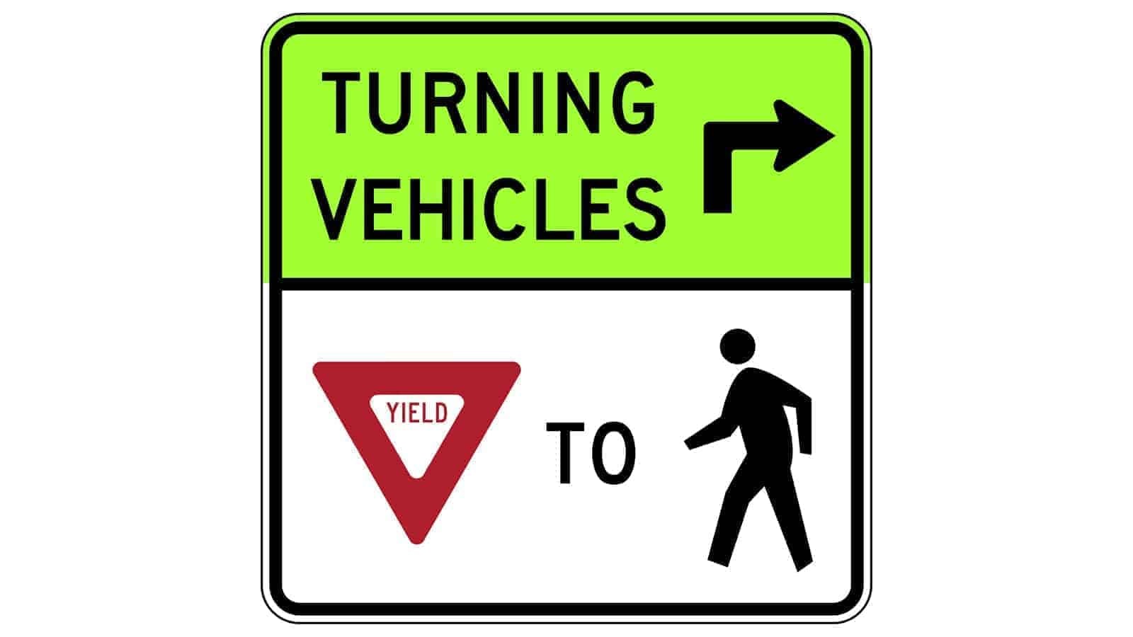 Turning Vehicles Yield to Pedestrians Sign. This sign indicates that all turning vehicles must yield to pedestrians.