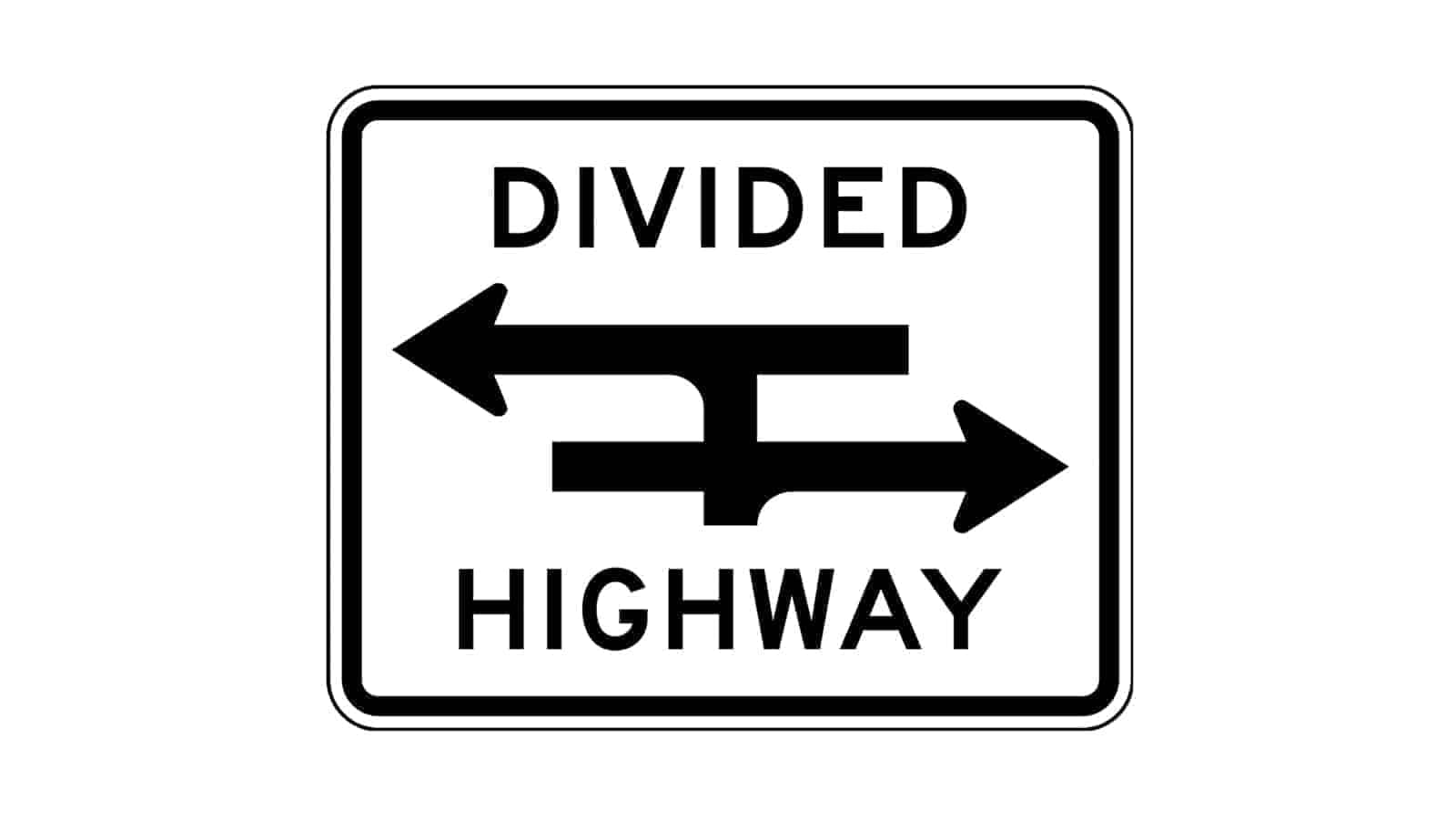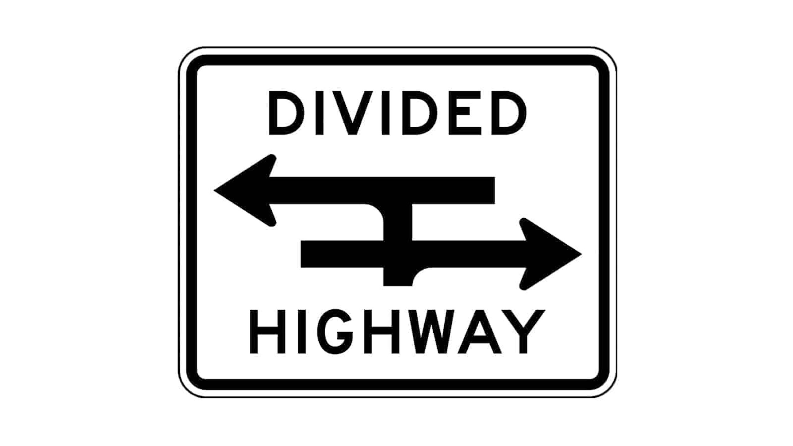 Divided Highway Crossing T-intersection Sign. This sign indicates that you are approaching a T-intersection with a divided highway.