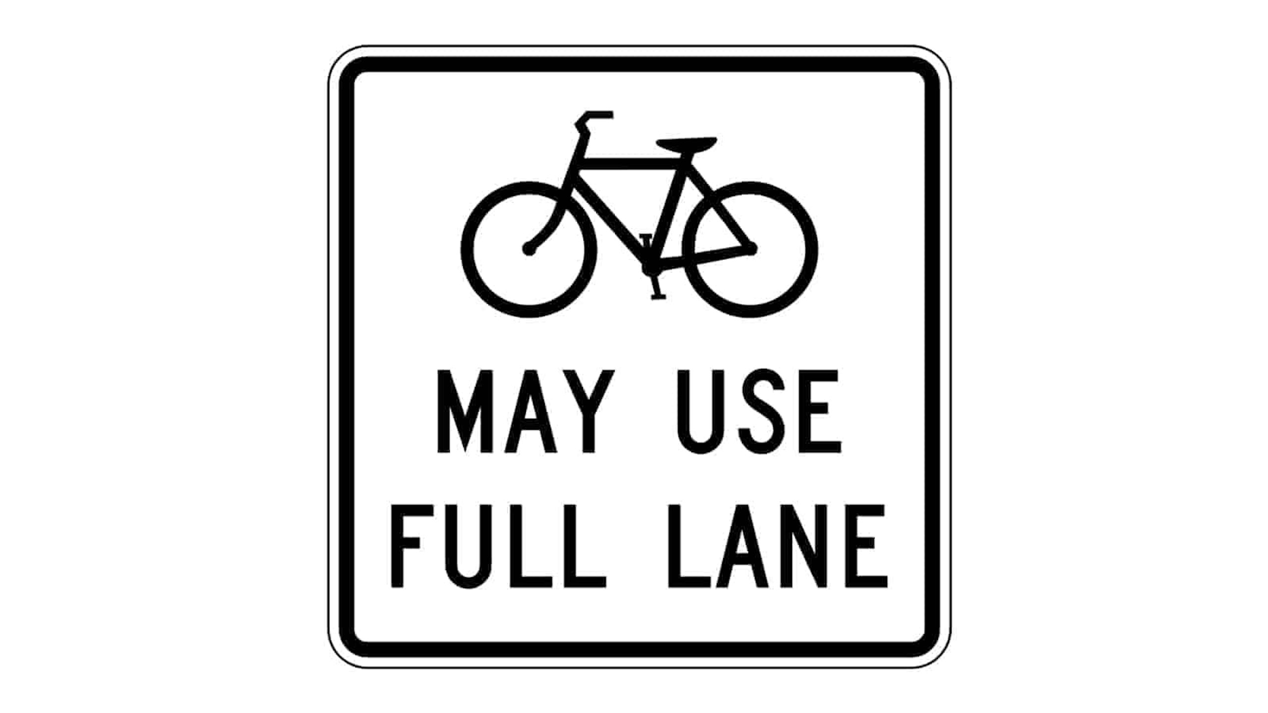 Cyclists May Use Full Lane Sign. This sign indicates that cyclists may use the full lane on the road ahead.