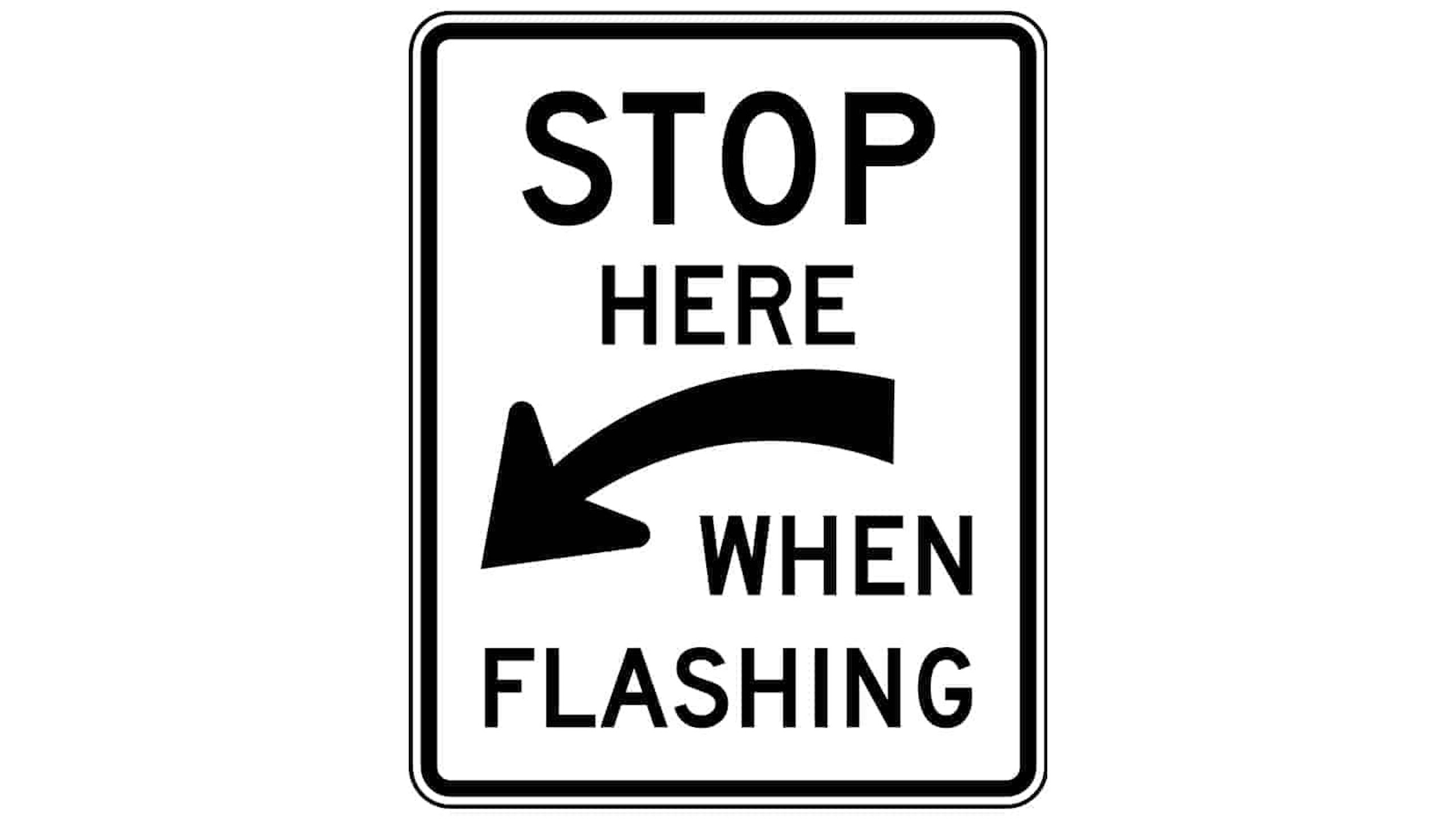 Stop Here When Flashing Sign. This sign is often found at railroad crossings and indicates the position you should stop when the lights are flashing.