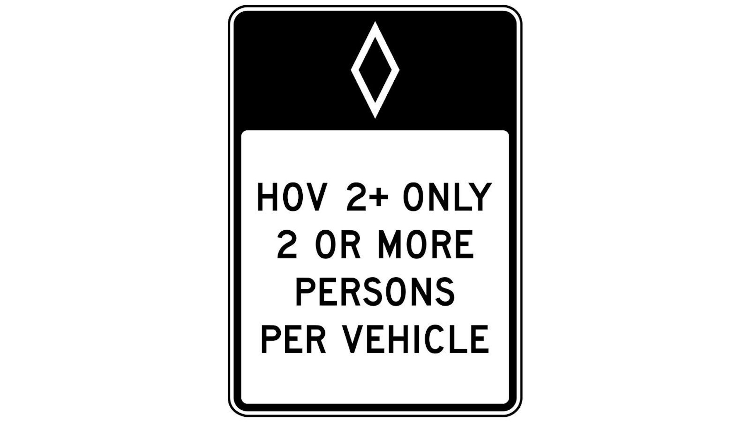 HOV 2+ Sign. This sign indicates that you may ONLY drive in this lane if there are 2 or more persons in the vehicle including the driver.